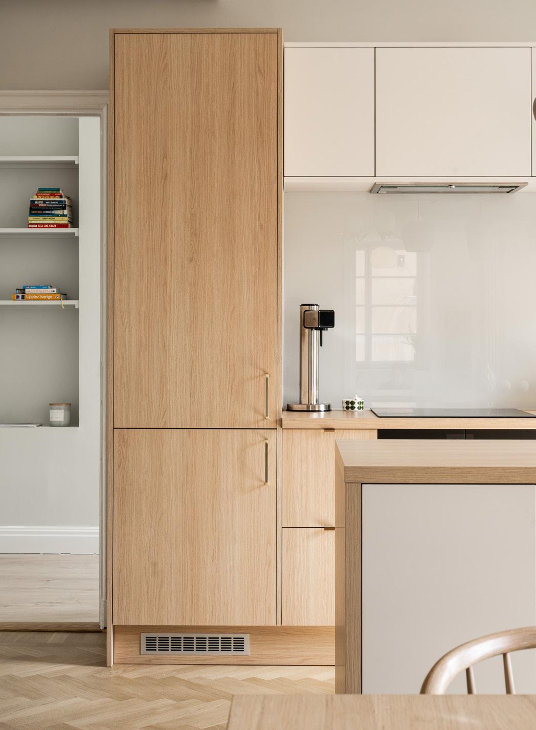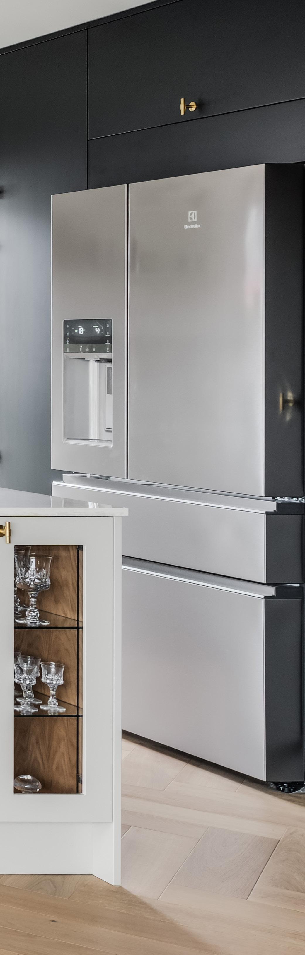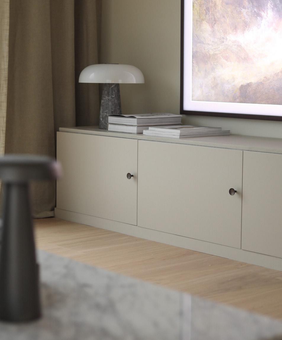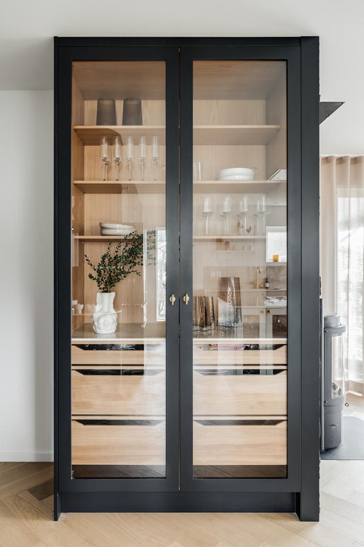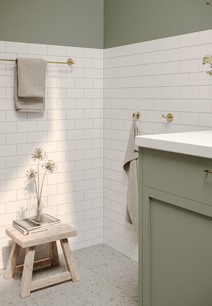 Ett vitrinskåp med belysning ger rummet liv och skapar djup, medan fiskbensparkett tillför värme och taktilitet. De noggrant utvalda mässingsdetaljerna – som blandaren och våra knoppar T Uniform i massiv mässing – lyfter helheten och adderar en känsla av exklusivitet.