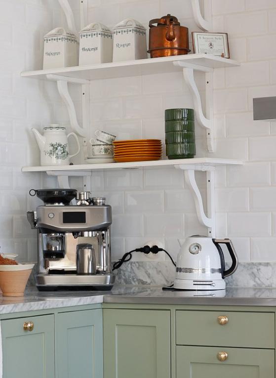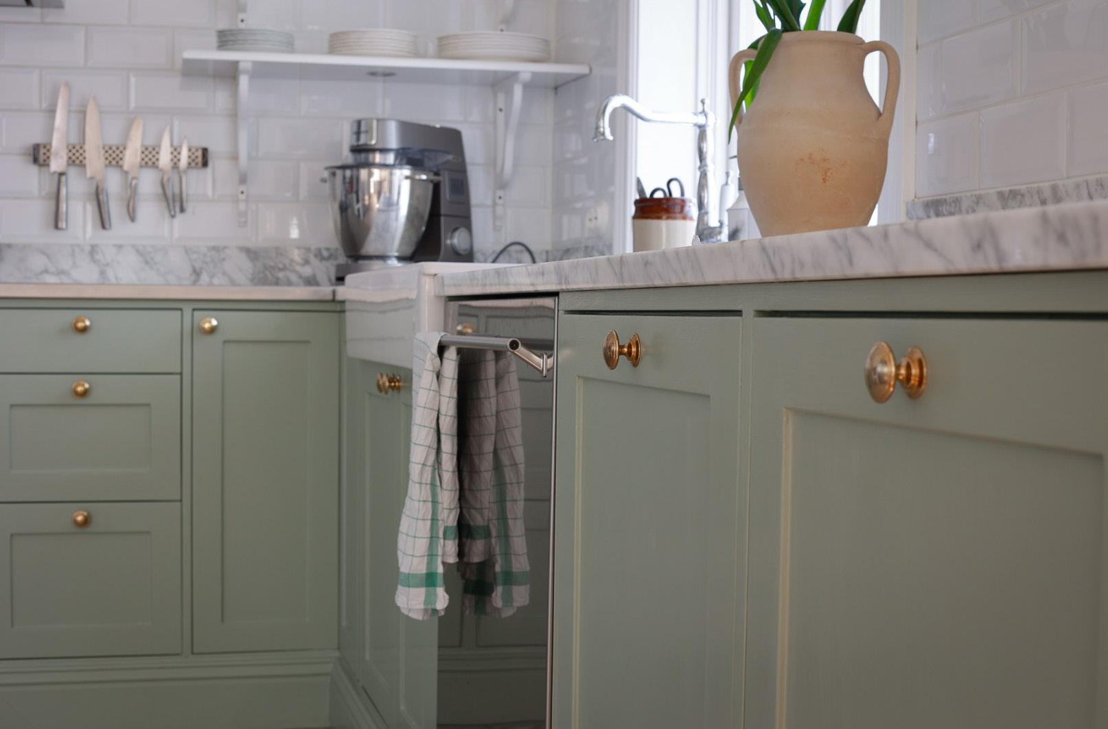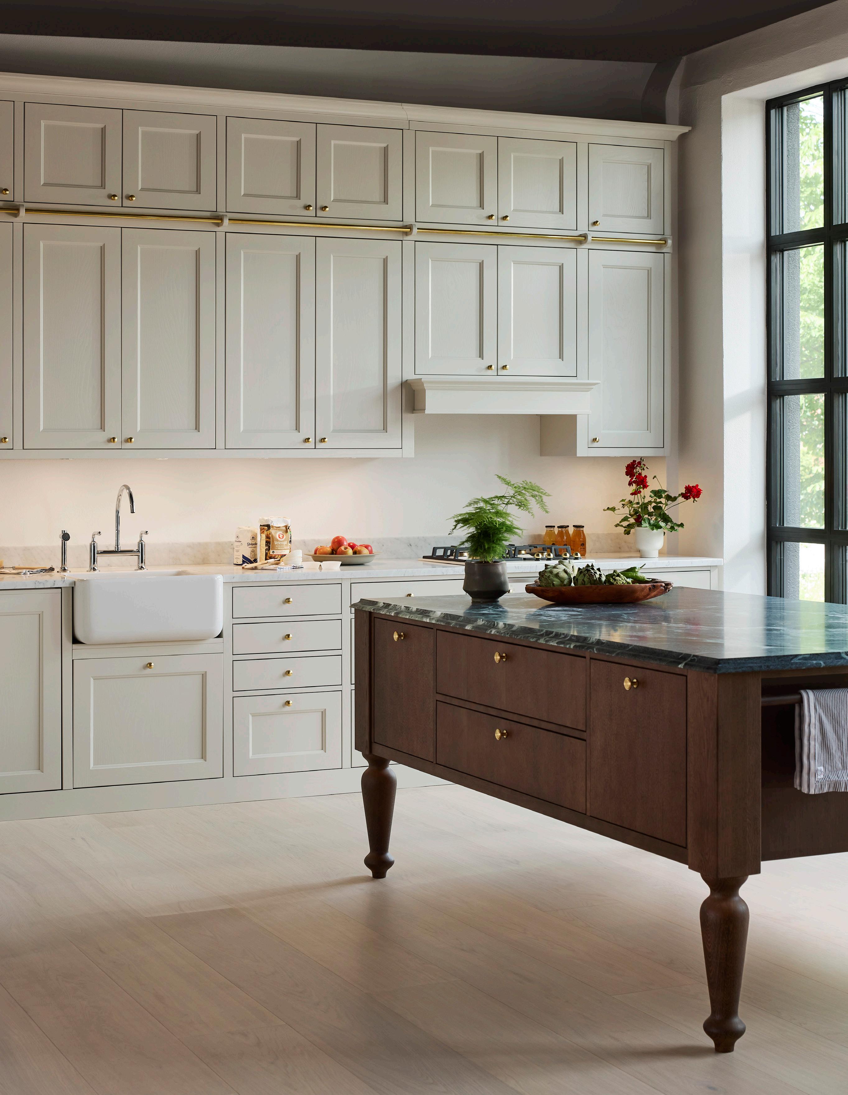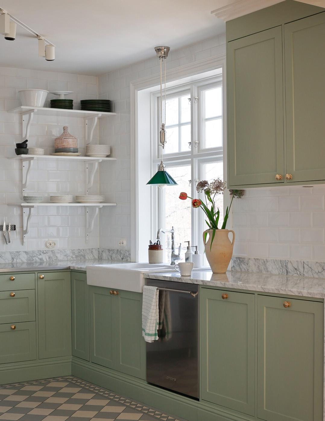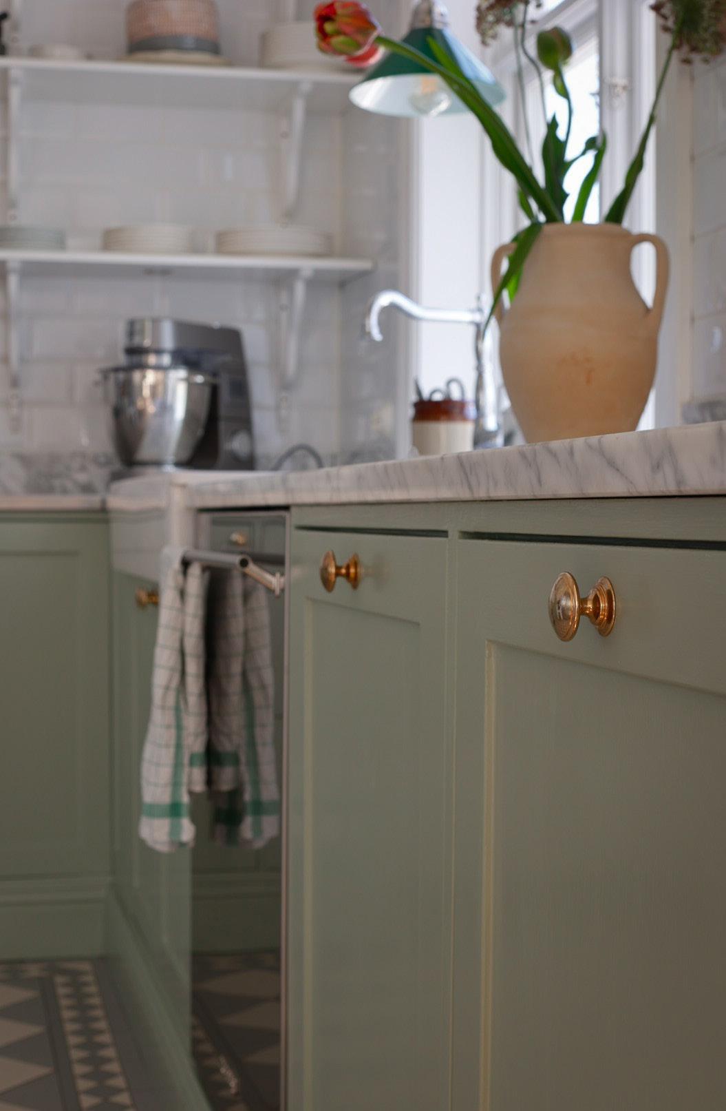 Mitt i köket står en köksö i mörkt trä, som skapar en vacker kontrast. Ovanpå vilar en grön marmorskiva med levande ådringar – en oväntad detalj som adderar ett modernt djup till det traditionella uttrycket.