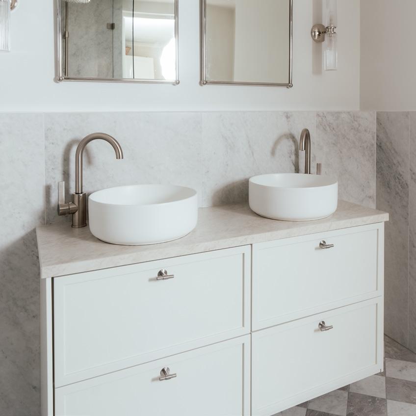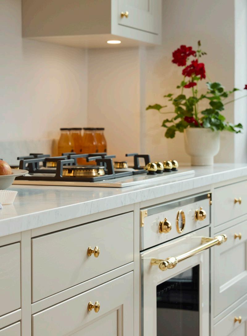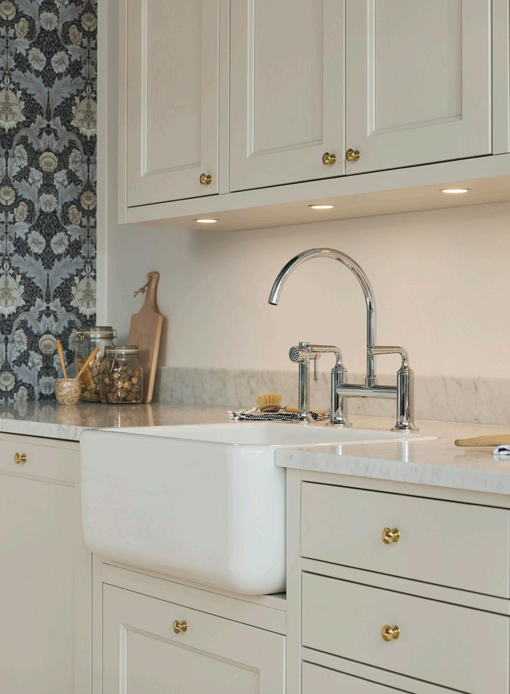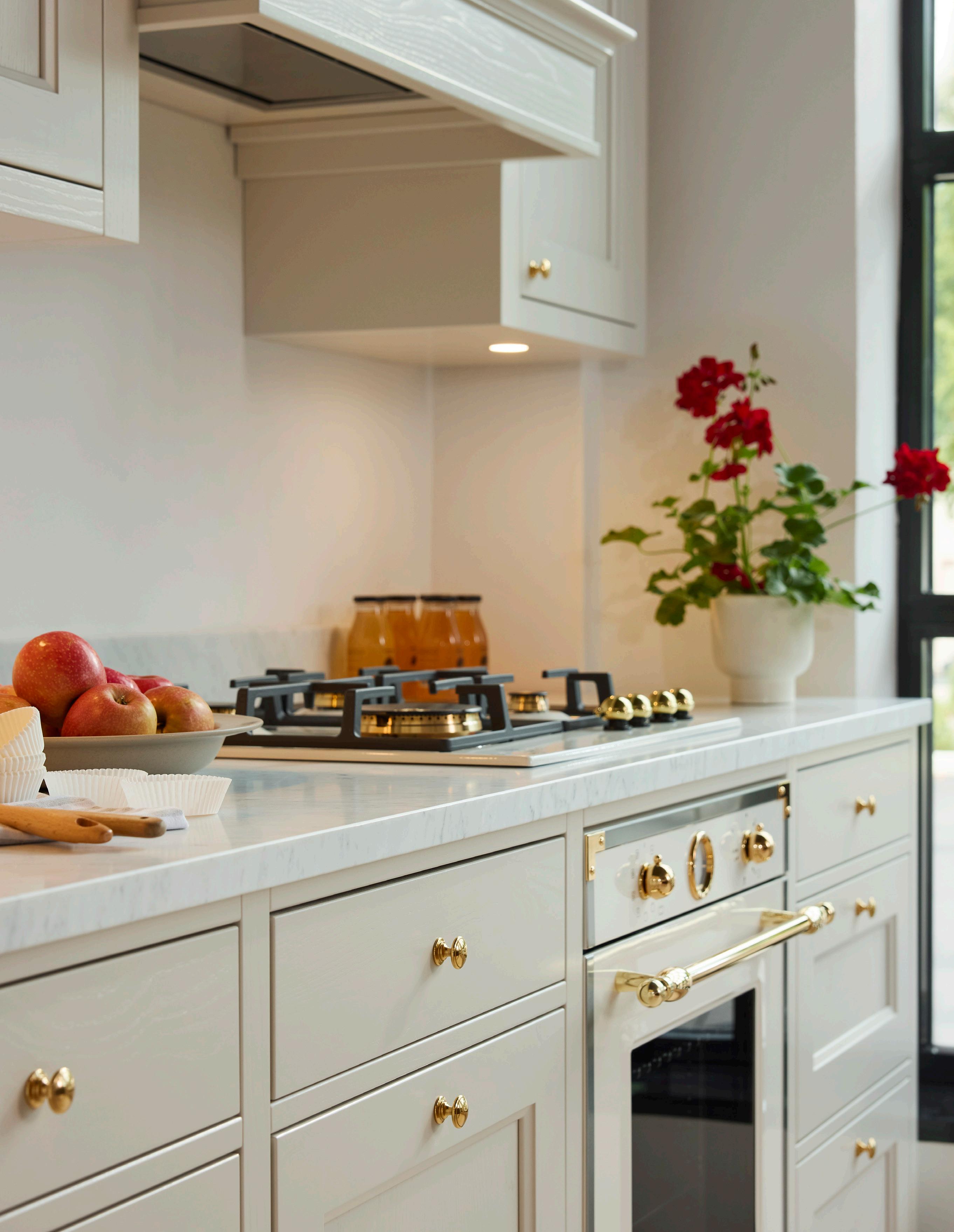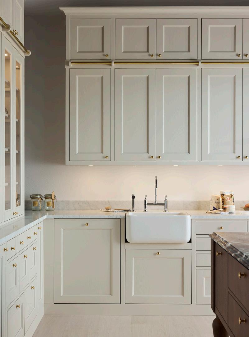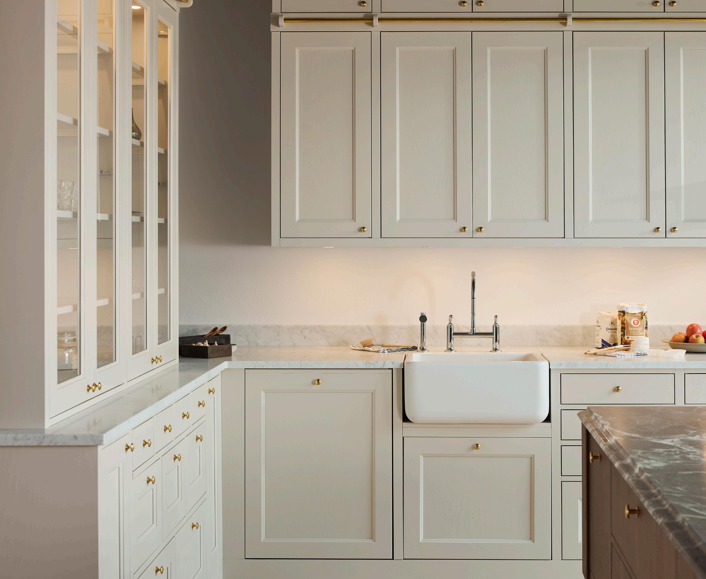 Det här köket är en hyllning till det tidlösa hantverket –platsbyggt i vitt, med klassiska ramluckor som ger ett mjukt och inbjudande uttryck. Marmorskivor i ljusa toner vilar över arbetsytorna och skapar en känsla av ljus och elegans, samtidigt som de lyfter fram rummets traditionella charm.