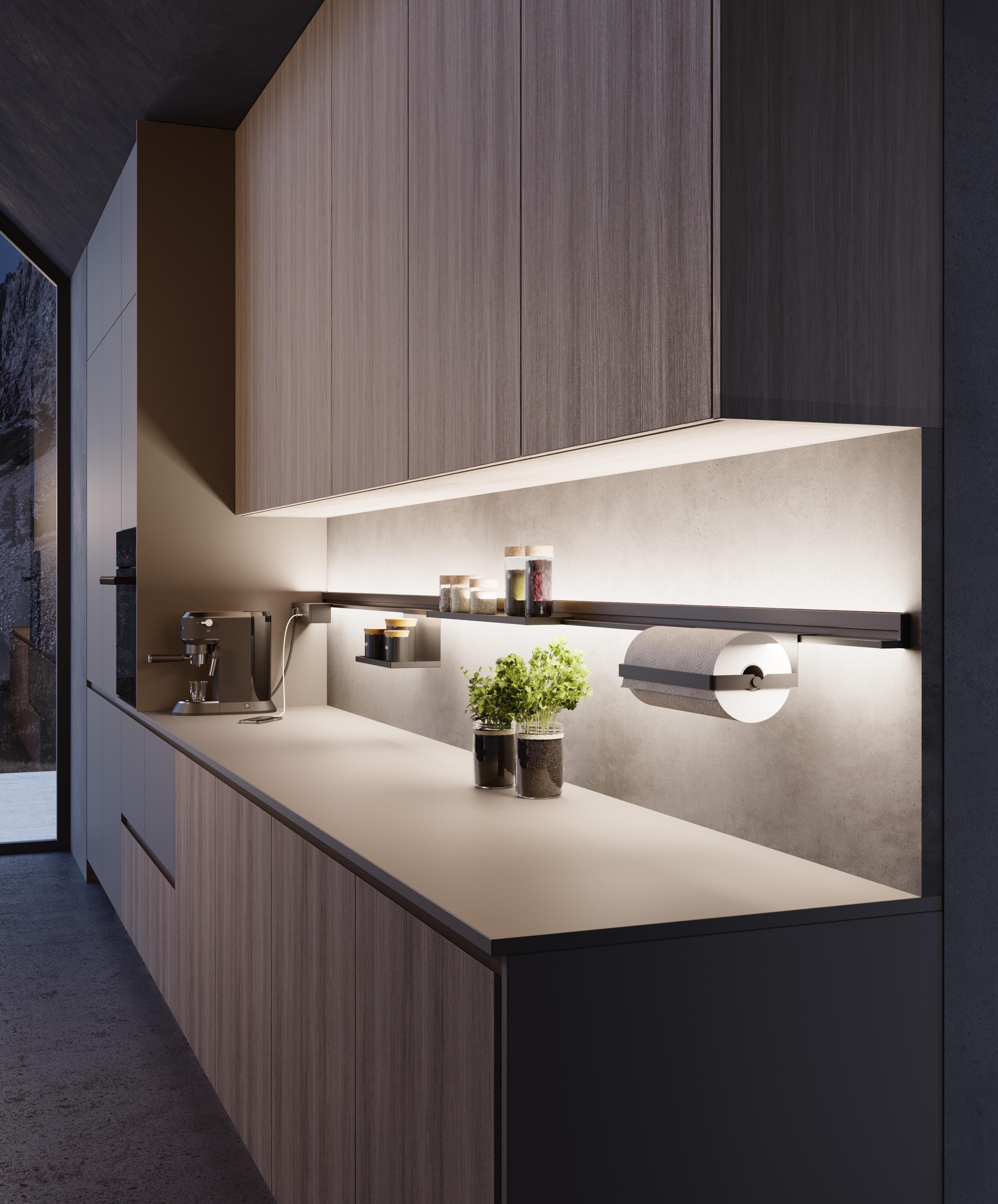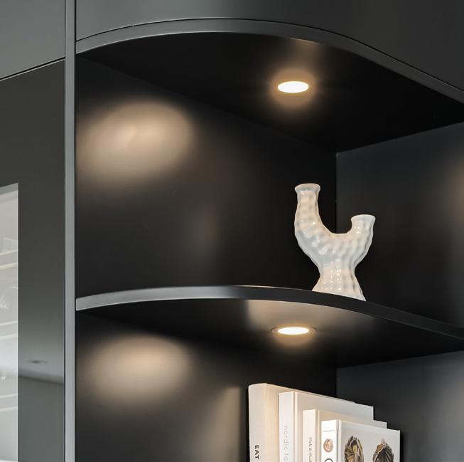 HOLL D-M är en infälld armatur för frästa spår, skapad med fokus på det subtila uttrycket. Den cirkulära designen framhävs inte av formen – utan av ljuset självt. Resultatet är en diskret men effektfull ljusbild som smälter samman med möbelytan och skapar en känsla av att armaturen är en naturlig del av helheten.