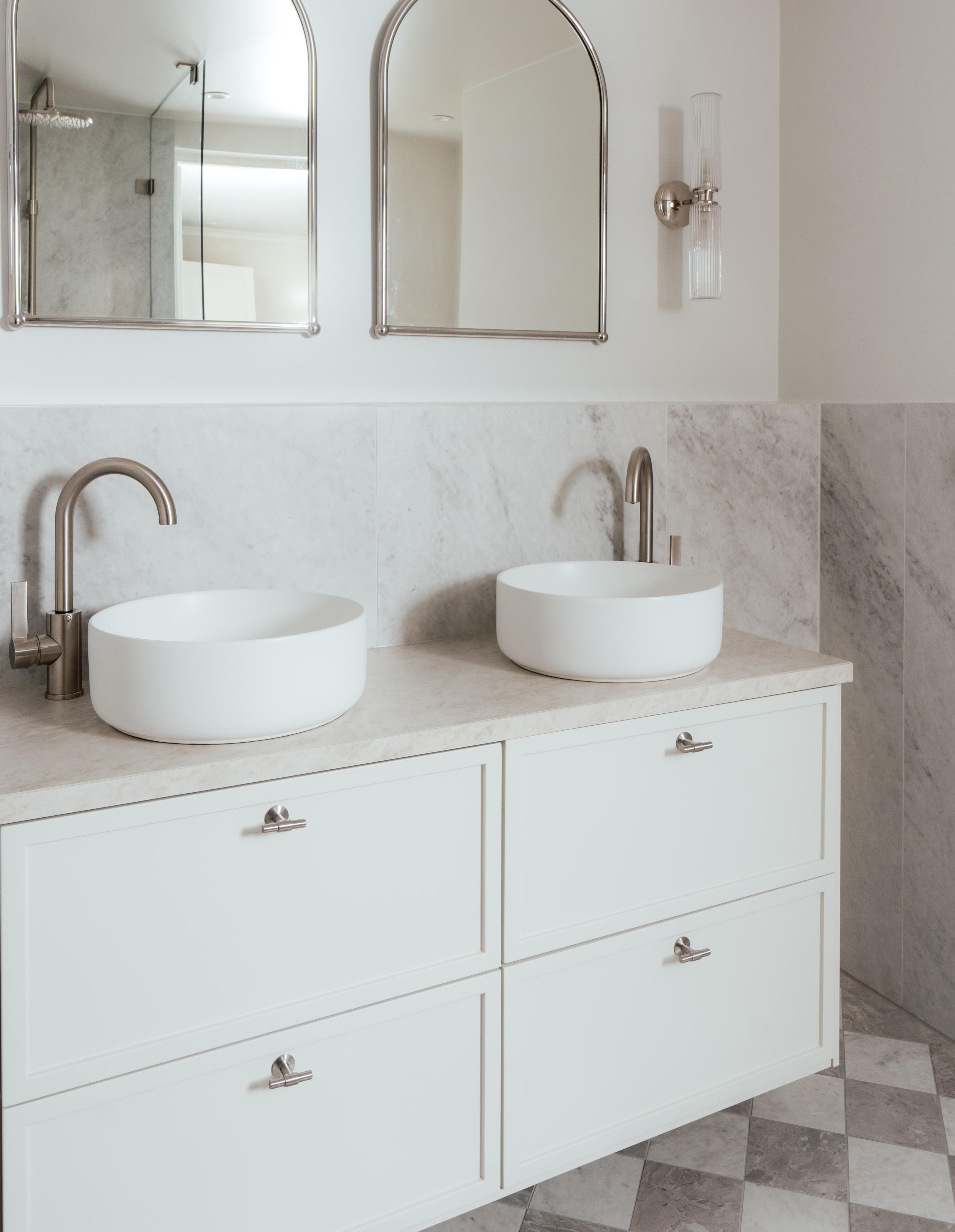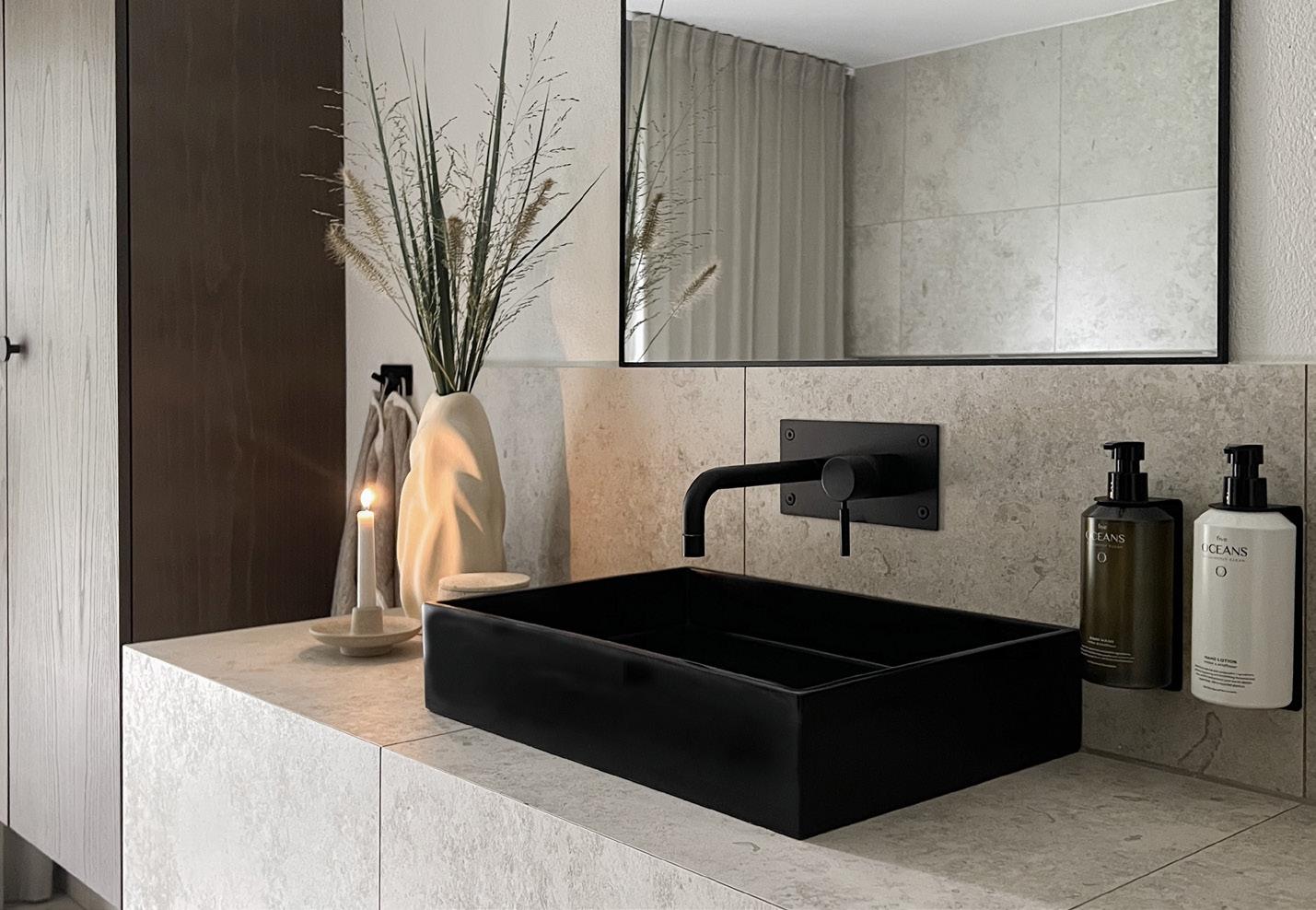 I badrummet fortsätter berättelsen. Svarta beslag mot grå ytor skapar ett grafiskt lugn – där varje detalj är genomtänkt, varje val är medvetet. Ett rum för avkoppling, energi och vardagslyx.