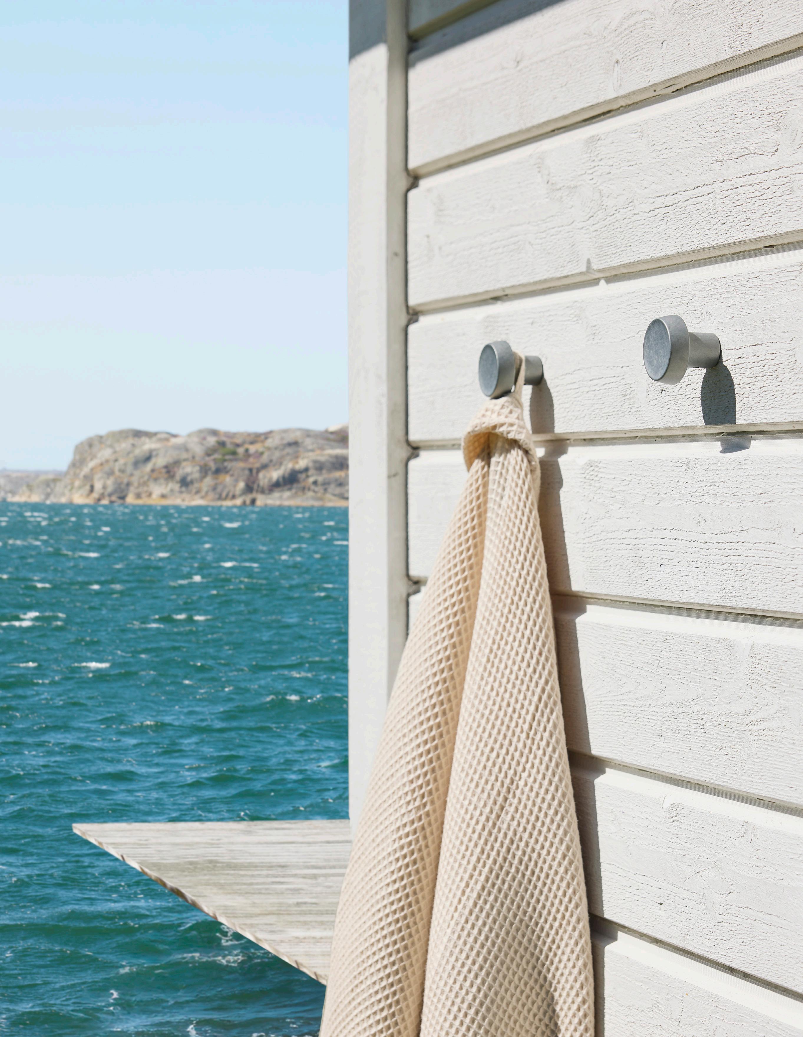 – en generös krok i zink med en radie på hela 50 mm – skapad för att ge plats åt det lilla extra. Den robusta konstruktionen och det generösa djupet gör den perfekt för utomhusbruk, exempelvis på bryggan där den kan bära allt från badrockar till handdukar efter ett dopp. En detalj som kombinerar tålig funktion med stilren design, och som låter vardagens ögonblick vid vattnet bli både smidigare och vackrare.