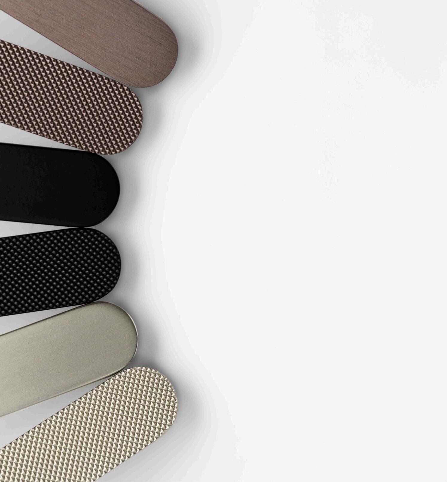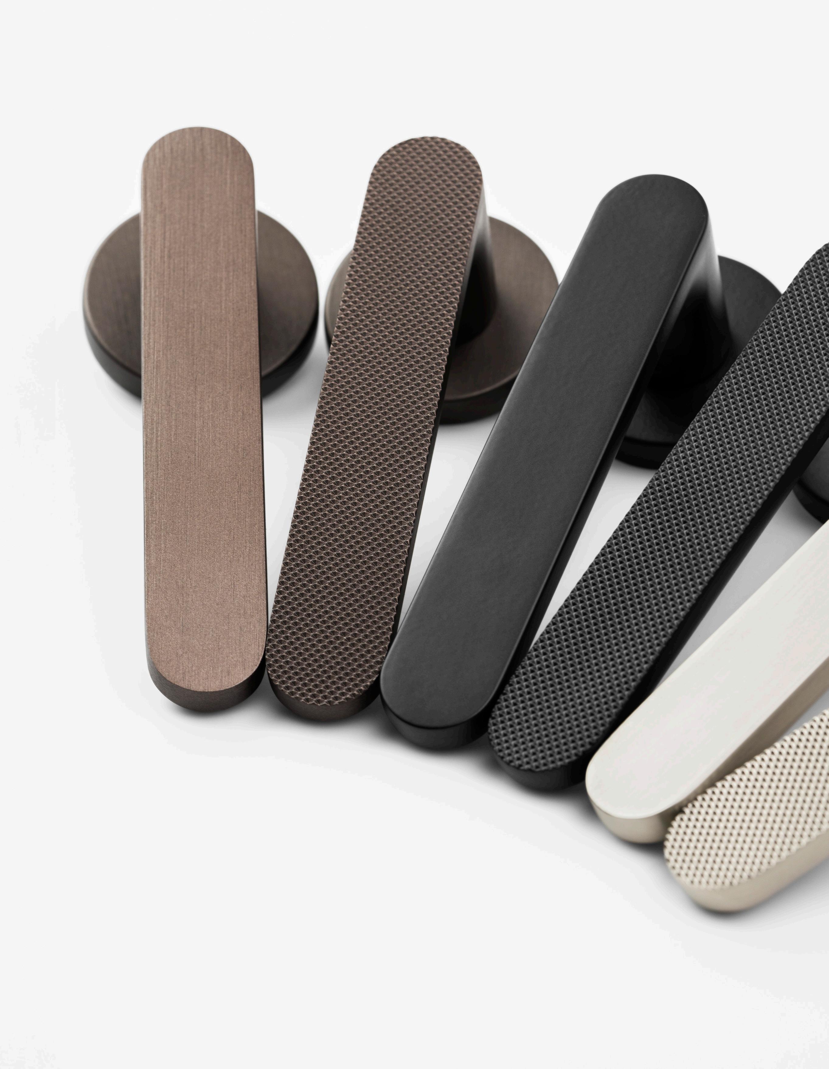 Vibe är exklusiva, återfjädrande dörrhandtag som kombinerar stilren design med en industriell känsla. Välj mellan lättrad yta för ett taktilt, modernt uttryck eller slät för en mer avskalad elegans – båda med behaglig känsla i handen. De är kompatibla med låskistor enligt både skandinavisk och europeisk standard, vilket gör dem till ett flexibelt val för olika miljöer. Komplettera med krokar i samma uttrycksfulla design – för en helhet som håller ihop i både känsla och funktion.