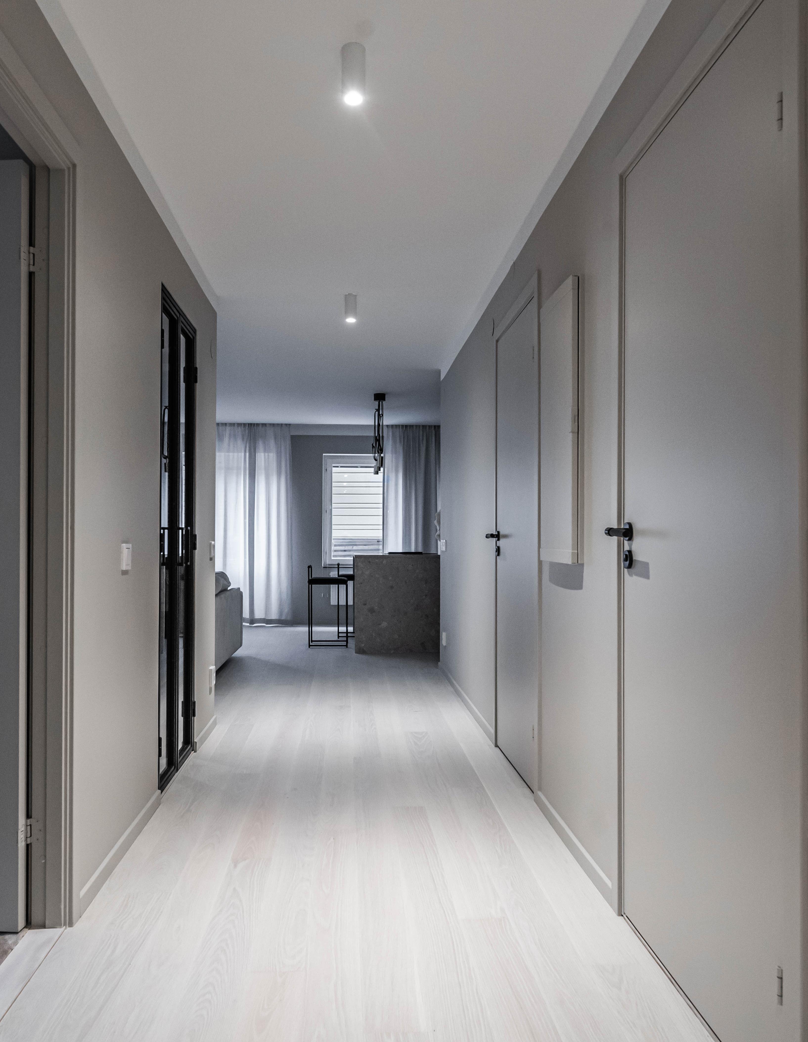 Grå toner skapar en lugn och tidlös bas i både hall och badrum –en färgpalett som andas balans, enkelhet och modern elegans. I kontrast lyfter svarta detaljer som dörrhandtag och knoppar fram rymden och förstärker uttrycket, utan att ta över.