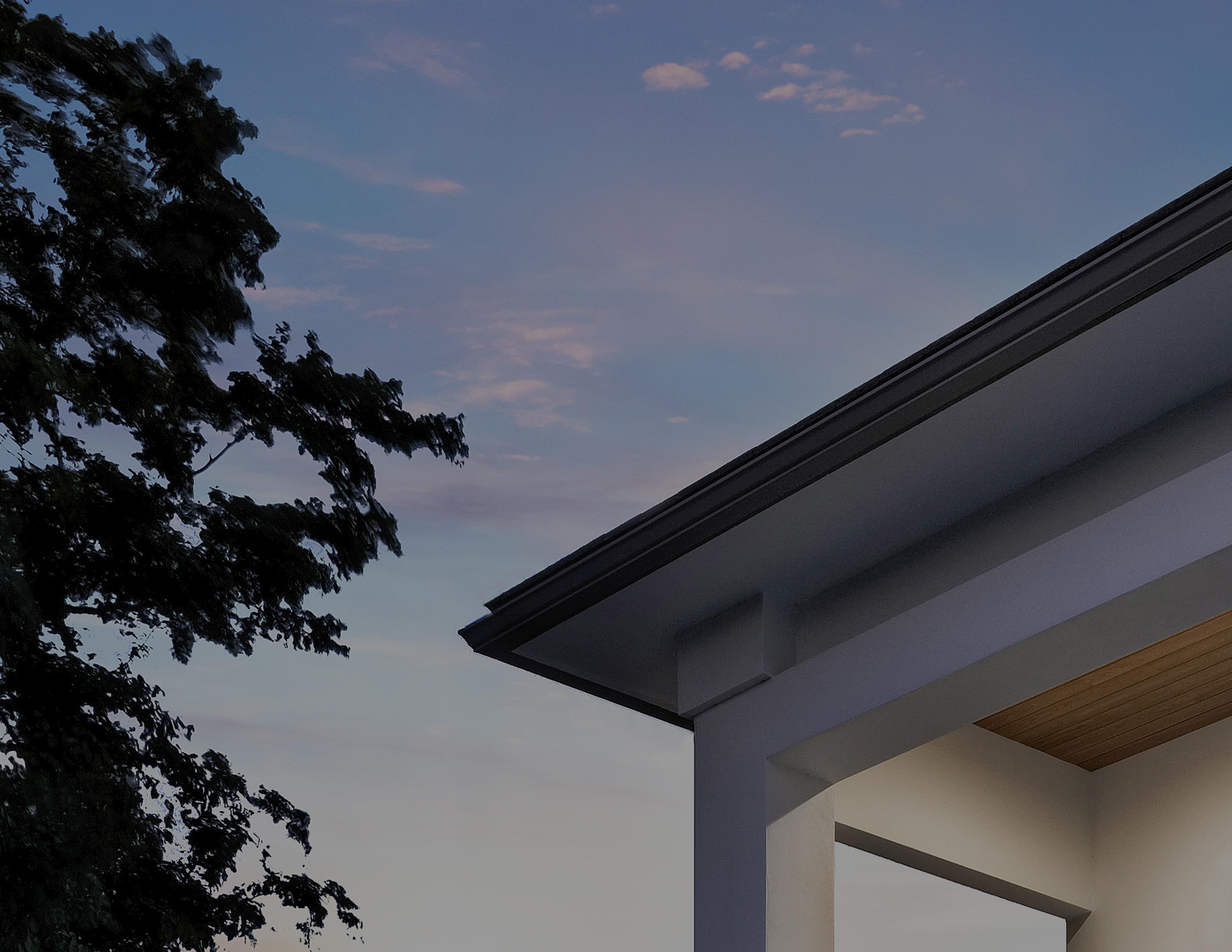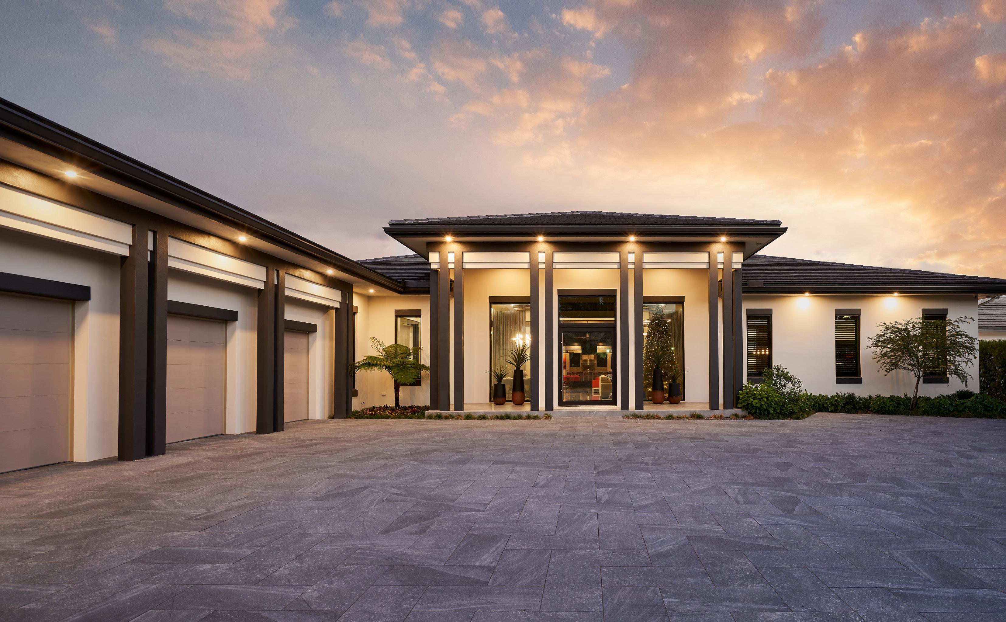 Exterior architecture can be customized with either a contemporary flat roof or a more transitional peaked roof to suit homeowners’ individual aesthetics.