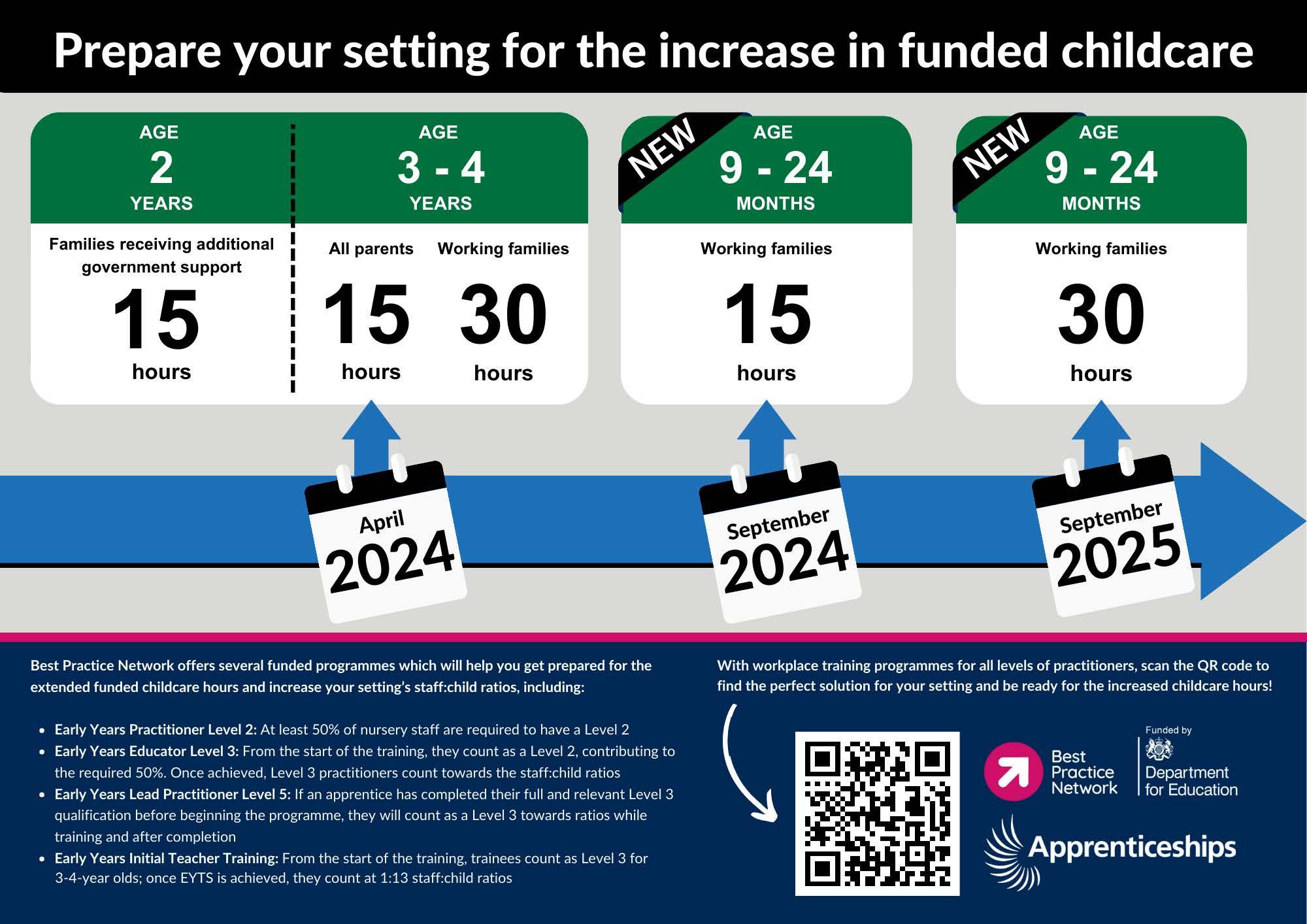 We have created poster that you can download with the dates and changes coming for funded childcare hours. We have also included an explanation of the qualification levels that Best Practice Network provide and how they can boost the Staff:Child ratio. Please use this poster in your setting and get in touch if you need any support with training or recruitment.