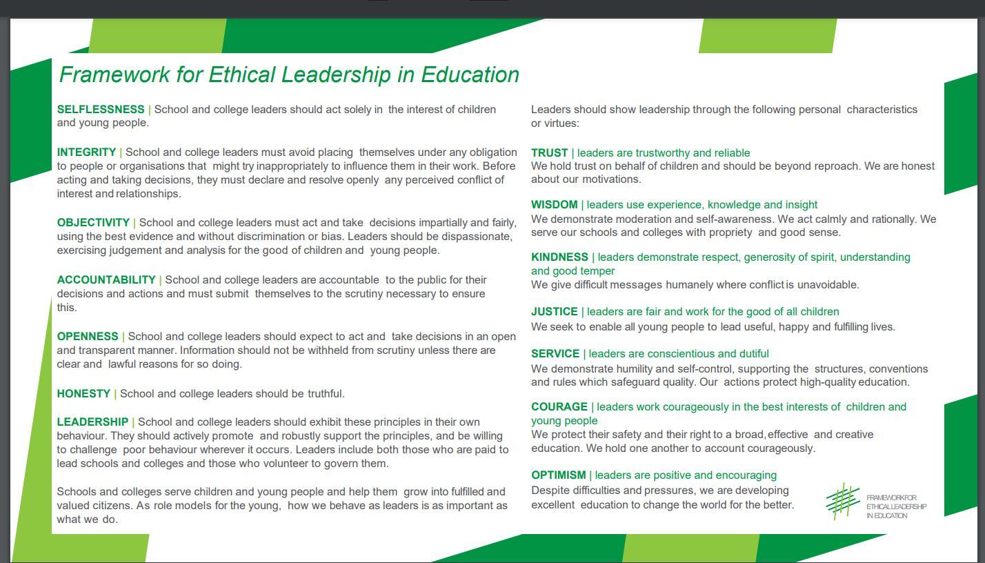 Headteachers uphold and demonstrate the Seven Principles of Public Life at all times. Known as the Nolan principles, these form the basis of the ethical standards expected of public office holders.