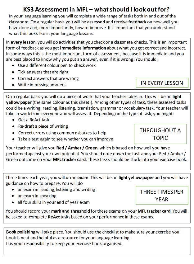 The assessment resources may take various forms: for example, worksheets, feedback labels, peer assessment templates, activity packs, entry and exit tickets, exam papers, traffic light cards, assessment for learning (AFL) resources, self-assessment sheets.