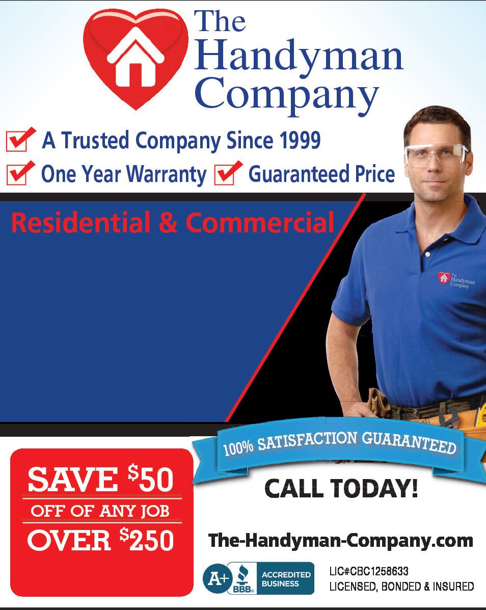 24 Exclusively Home Improvements To Advertise Call 239.351.2424 www.EHIMag.com FREE GATE with purchase of a Metal Fence Must present ad at time of estimate Restrictions Apply Expires 11-1-22. CALL 239.247.2367 Professional Fence Contractor of SWFL | AllFenceContractors.com 17 Years of Experience | Licensed & Insured | Lic# 67279 / Lee FN21-00178 Vinyl Fence • Chain Link Fence Wood Fence • PVC Fence • Ornamental Fence Aluminum Fence • Shadow Box • Pool Enclosure FINANCING AVAILABLE PORT CHARLOTTE ● PUNTA GORDA OCTOBER 22 & 23 Saturday & Sunday ~ 10AM - 4PM (BOTH DAYS) CHARLOTTE HARBOR EVENT CENTER 75 TAYLOR STREET, PUNTA GORDA, FL On the river, between the 2 bridges Visit us at HGSHOWS.net THE ORIGINAL SPONSORED BY FREE ADMISSION & PARKING FALL ● See the newest in home improvement products & services ● Furnishings, accessories, decorating & remodeling ideas ● The latest from floor to roof, patio to pool, inside & out 29TH ANNUAL H&GPtCharFall2022BestDealsMech.qxp_Layout 1 9/1/22 3:56 PM Page 1 Labor only. Not valid with other o ers. Expires 11/1/22. • Handyman Jobs • Crown Molding & Baseboards • Drywall & Painting • Doors & Windows • Carpentry & Fencing • Flooring & Much More... 239-347-2915 LIC#CBC1258366 Serving Lee County Only