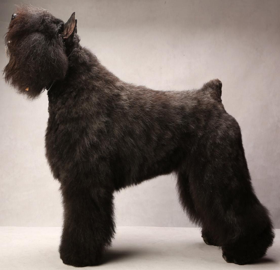 interesting and a wonderful learning experience; I met so many wonderful dog people. In 1986, I had my first owner-handled BIS with Bandit, where the late Walter Pinsker sent us to the BIS line—a very special memory. I began breeding under the prefix “Barbu,” and over the years also under “JBB” and “BarJen.” In 1995, I was asked to judge sweeps at the American National. I loved it. In 1996, I started on the path to becoming a judge. I set a goal to attain my all-breed judging credentials to give back to the sport as well as continue with purebred dogs once I retired from my everyday profession. Dogs are my passion. I achieved my goal in 2017, and I am retiring from regular work on August 30, 2024, to focus more on my judging career. I no longer own Bouviers, as my aging body cannot handle the grooming or showing of them, so I downsized to my current breed, Affenpinschers. This breed is a Bouvier at a reduced size. My current dog, whom I purchased as a pup in 2019 just before COVID hit, is from V. Tani Kazari Kennels in the Netherlands. He has been my rock, made me laugh every day, and has proven himself to be quite a show dog. He earned his American and Canadian titles, then went off to Europe, where he earned multiple BISs and was awarded BIS #3 at the World Dog Show in Geneva ’23. I also have a little girl Affen, who I like to call my very, very, very expensive pet, but I love her dearly.