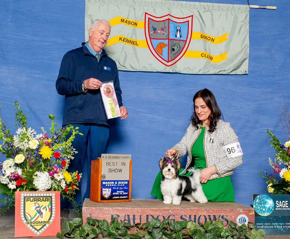 My first Best of Breed win at Montgomery County was very memorable—it was with a wire fox terrier named Silverback. I achieved my first Best in Show victory with a wire fox terrier from the 9-12 puppy class on my 21st birthday, under the judging of Michelle Billings.