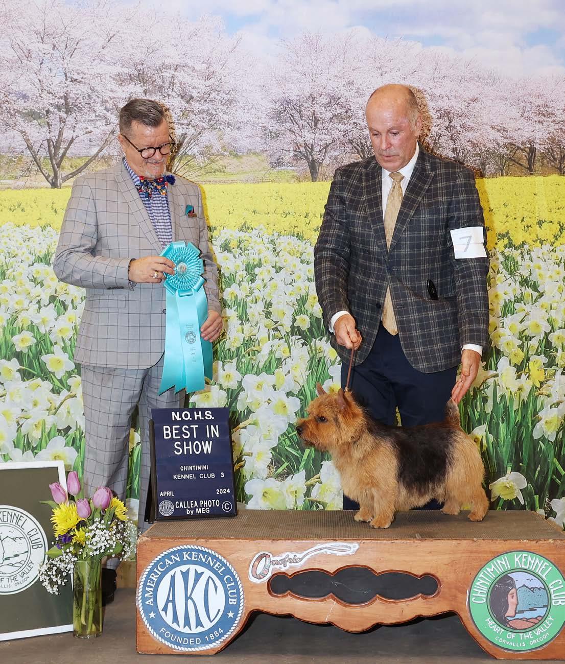 We attended the 2022 Palm Springs show to “look” at Norwich Terriers, as Mark was enamored with the breed. Everyone around the Norwich ring insisted we speak to Cary Trexler and Andrew Chen of Verdant Kennels. Over the following months, Cary and Andrew had litter after litter of puppies until six months had passed before they found the puppy that matched our goals. They informed us, “Your puppy is ready! ...and Gabriel is expecting you.” We were puzzled and asked, “Who is Gabriel?” We were complete novices, knowing nothing and nobody in the world of dog showing.