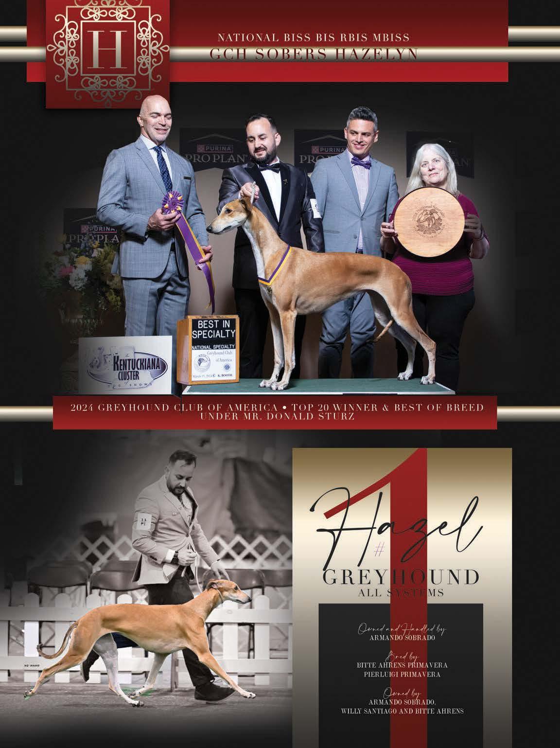 I have been extremely fortunate to have numerous mentors who have played a crucial role in laying the foundationofmyhandlingskillsanddogknowledge,but my most prominent mentor has been Alicia Morrison Jones. Alicia happens to be my mother’s best friend and one of the most exceptional sighthound handlers of all time.Sheexcelsinherconditioningandpresentationof many breeds, especially Afghan Hounds, and has always supported me. Alicia has been watching me ringside since I was a little girl with a dog twice her size and continues to do so now. She provides me with valuable feedback on how I can continue to improve, and I am forever grateful to her.