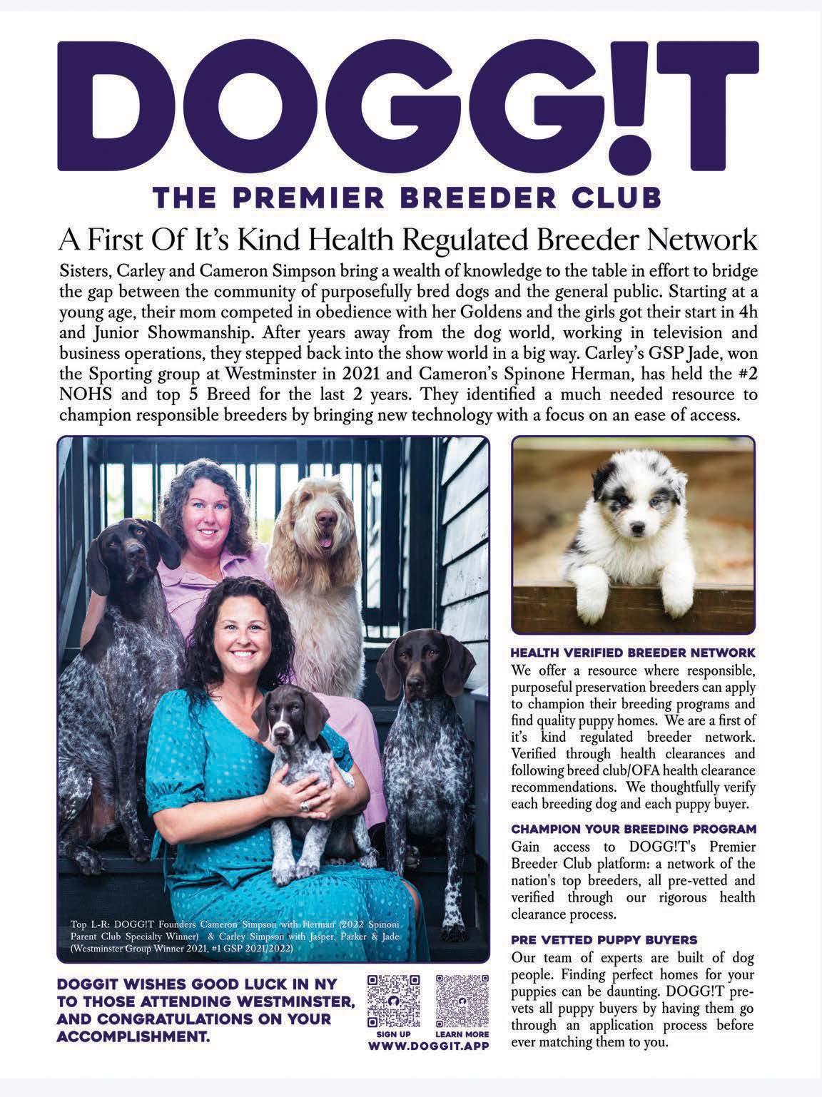 What DOGG!T Offers to Breeders: The inaugural feature introduced for breeders is The Premier Breeder Club, which has already attracted over 500 of the nation’s top breeders. DOGG!T provides a streamlined solution for organizing breeding programs. Accessible from any device, breeders can easily manage dog health clearances, pedigrees, and essential documents for each dog.DOGG!Twillsimplifythetaskofmaintainingpuppy buyer lists and facilitate seamless communication with prospective and pre-vetted buyers. DOGG!T empowers breeders through its Premier Breeder Club, offering supportandrecognitionthroughresponsiblemarketing initiatives. By pre-vetting potential puppy homes, DOGG!T aims to alleviate stress in the search for ideal placements. Breeders incur no costs, and initial puppy deposits are transferred directly to them from DOGG!T. Upon determining the right fit home for their puppy, final payment is made directly from the puppy buyer to the breeder, adhering to the breeder’s terms. The qualification process to be a member of The Premier Breeder Club consists of verifying breed specific health clearances for any breeding dog added on the platform. Looking ahead, DOGG!T plans to expand its offerings to include valuable resources such as puppy kits, perks from pet insurance providers, discounts on pet travel concierge services, and more. With a commitment to lightening the load for Premier Breeder Club members,