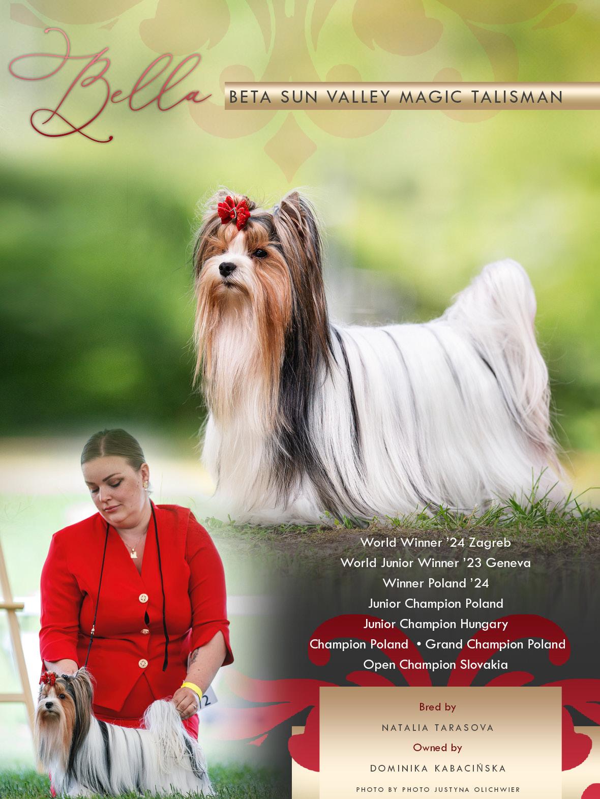 Thank you for this question. I am really proud of all the litters and each puppy born in our care. I write “our” as it is a team effort, initially supported by my parents and, in the last decade, by my husband, and of course, all the owners of our furbabies. I am very proud of my first litter—born in 2005—where we had 4 International Champi-ons. Two of them became Veteran World Winners and Best Veteran in 2013. We have champions bred by us on almost every continent, and as a result of our dogs’ achieve-ments, Sunnyfield’s kennel has become a “Gold-Wreath Master Breeder,” the highest recognition by the Hungarian Kennel Club. And