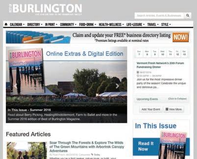 20 | www.bestofburlingtonvt.com ONLINE HUB WWW.BESTOFBURLINGTONVT.COM “LIKE” US ON FACEBOOK Follow us on Instagram @bestofburlingtonmag What does our newsletter include? • A summary of our most popular articles and comments from our readers • Local event listings from our calendar • Special offers from Best of Burlington and local businesses • Exclusive insights into upcoming features and articles, and much more . . . 9 JANU CLICK ON our online calendar to see local events happening in our community, and you can add your own event free! Feel free to drop us a line at ryan@bestoburlingtonvt .com, or share your comments on our site or on social media. You might even see your name in our next issue. Join the conversation online... www.bestofburlingtonvt.com SIGN UP TODAY! eNewsletter SIGN UP FOR OUR NEWSLETTER ONLINE EXCLUSIVES