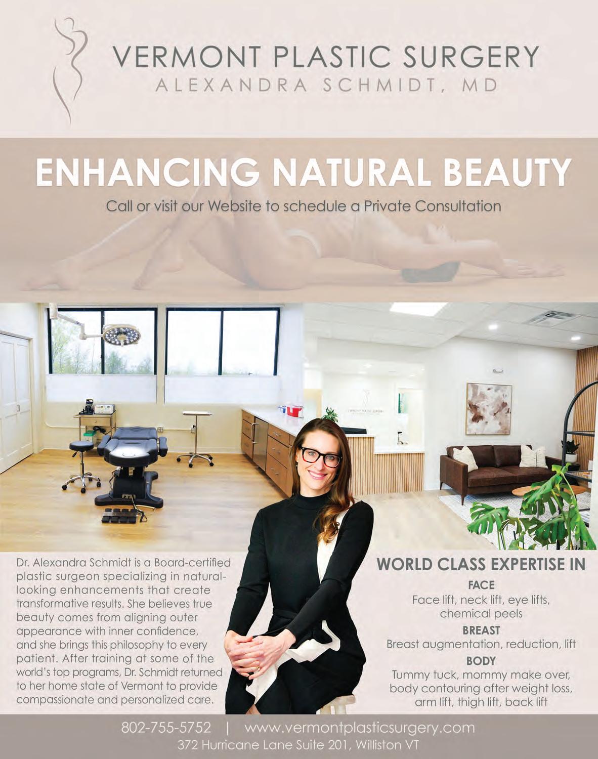 COVER PHOTO OF DR. ALEXANDRA SCHMIDT BY SARAH KJELLEREN, COURTESY OF VERMONT PLASTIC SURGERY
