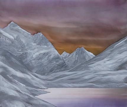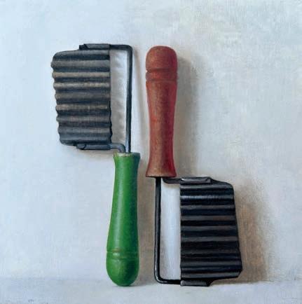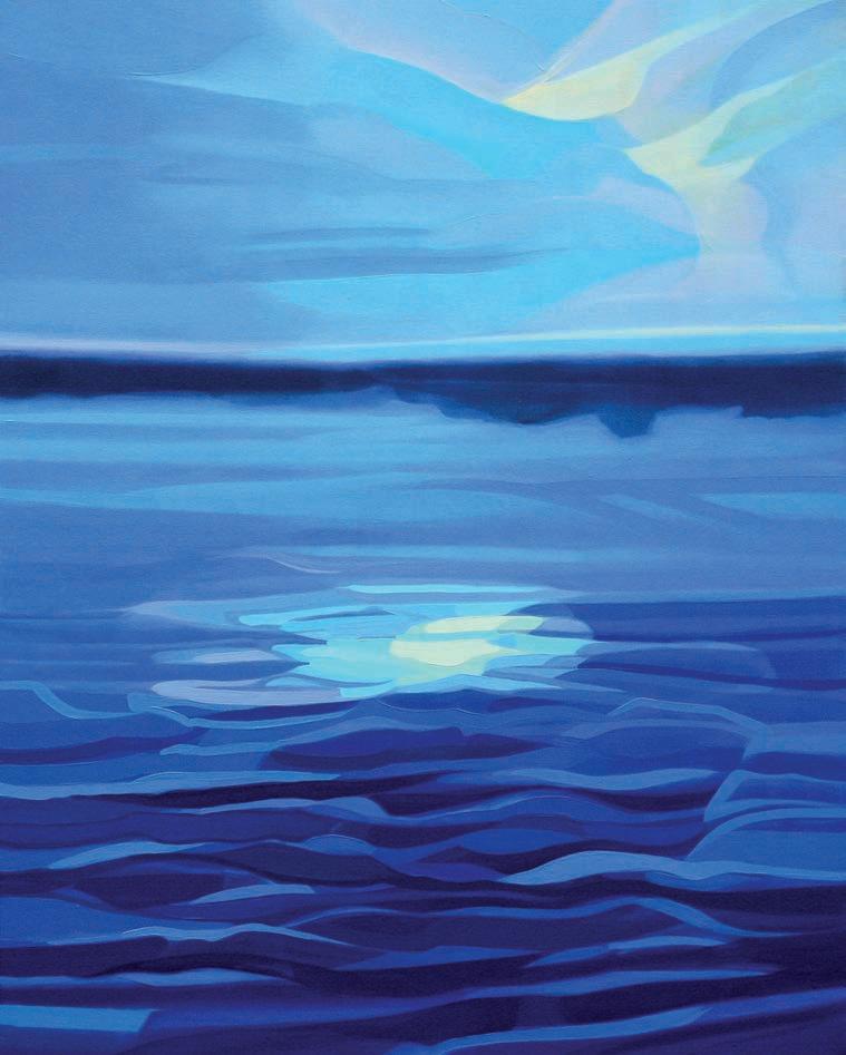Previous page: Tim Horn Ocean Camp 12'x16' oil on linen. This page, clockwise from left: Alexis Serio The Water Owns Your Heart 52"x42" oil on canvas; Homer Wells Torres Del Paine 38"x45" etched aluminum; Kate Gridley Untitled 8"x8" oil on panel; Helen Shulman Mixer 12"x12" oil on panel.
