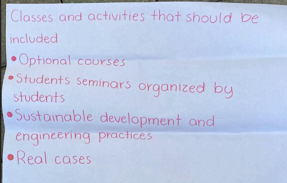 When it comes to a summary of all the projects made, it can be said that most of the teams focused on the importance of internships; highlighted the strengths of having ethical and humanitarian classes in order to improve the soft skills of students whilestillstudyinginthe university They also mentioned that social activities might motivate and encouragestudents to participate more in sustainable practices if these social projects are done with right intentionsandwithasustainableapproachandpractices. It can be said that the time of studies were mostly 4-6 years for each team, with an approximation of 5. They all decided that fundamental engineering classes necessary as expected but they had a heavier support on introductory classes for engineering and additional language classes alongside with classes to understand sustainabilitybetter During regular curriculums, it canbeseenthatsustainabilyisusuallyapartofaregularlygivenclass to raise awareness, however in each project it is seen that student preferred extra classes in ordertounderstandthetopicanditsrequirementsbetter.