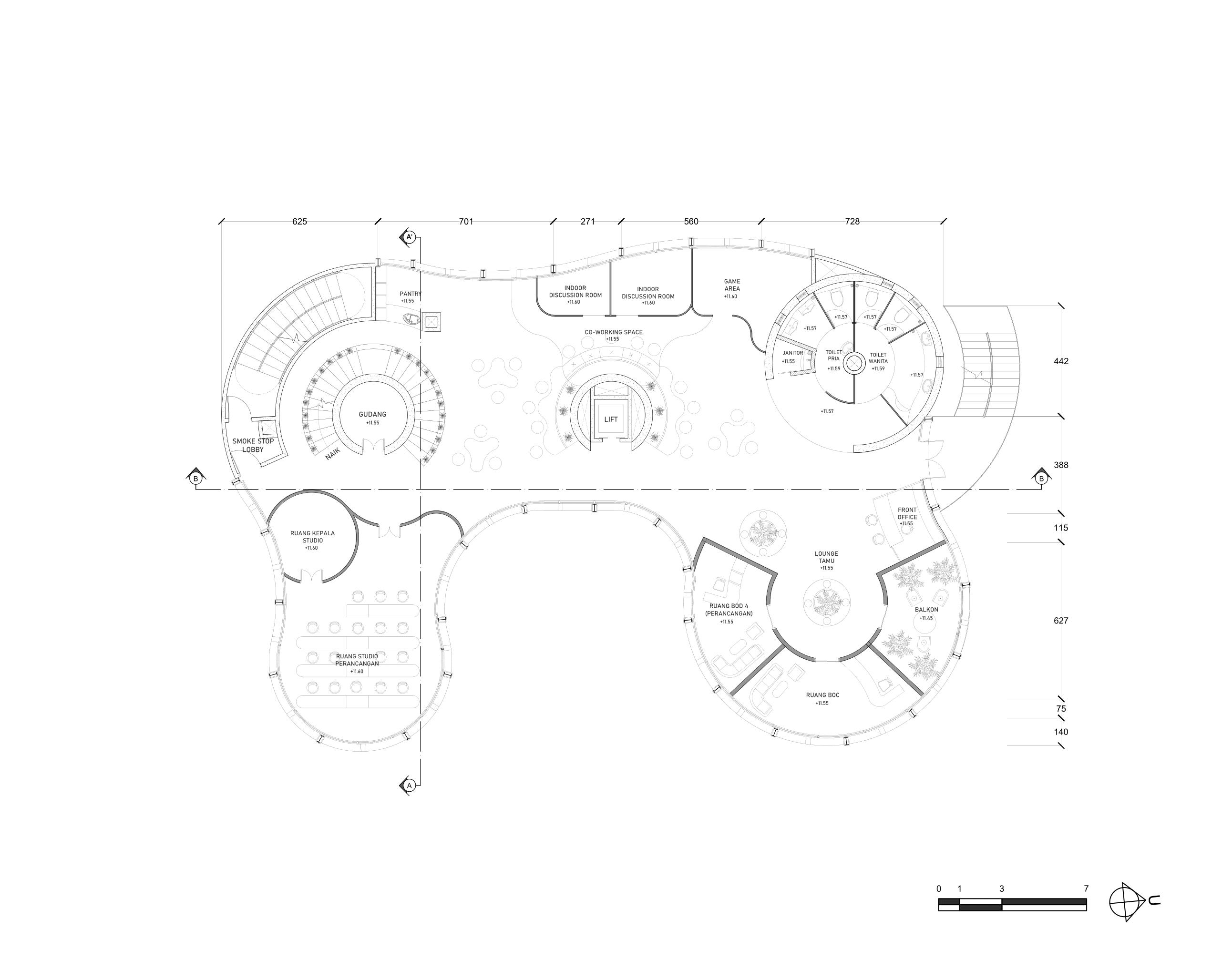 Massa bagunan dengan alur linear dan melingkar Void untuk memberi ruang bagi vegetasi eksisting sebagai pembentuk ruang