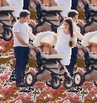 Ayah. ibu, dan bayi dengan stroller Bayi digendong oleh ayah/ibu