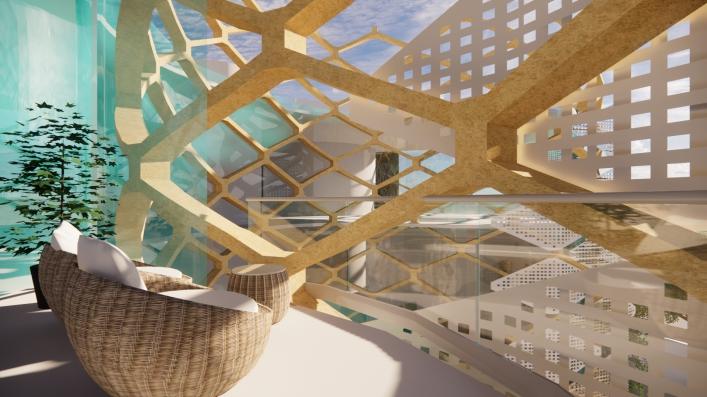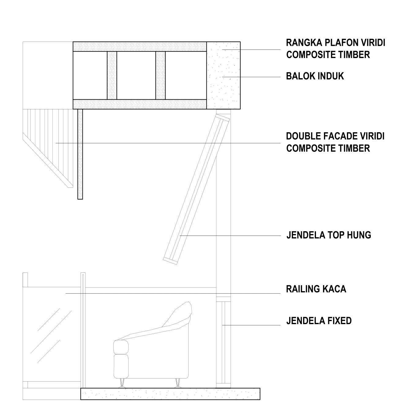 Balkon berguna untuk ruang transisi kamar dan luar. Selain itu, balkon dengan double fasad kisi-kisi Viridi Smart Composite Timber ini juga dapat menghalau panas dari terik matahari