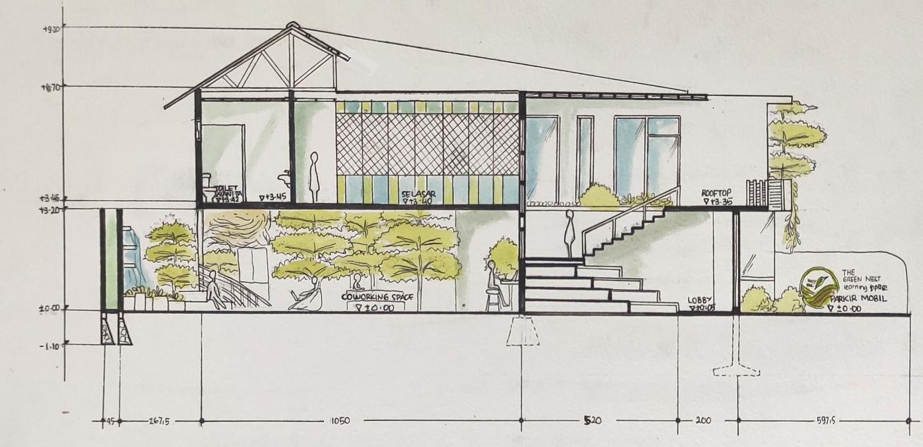 Lantai dasar yang cenderung bersifat publik digunakan sebagai ruang hijau, lahar parkir yaang memadai untuk mobil, motor, dan sepeda. Bagian yang cenderung menyatu dengan bangunan difungsikan sebagai coworking and colearning space dengan vegetasi dan kolam serta fasilitas li le nest untuk diskusi