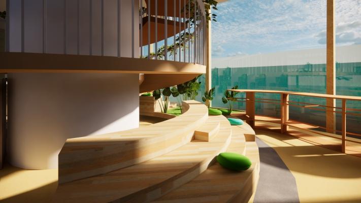 Mengingat pengguna yang lebih banyak menghabiskan waktu di sekolah dan kamar tidur masing-masing, ruang-ruang yang kerap dilewati oleh penghuni rumah pun dijadikan ruang interaksi, seperti di dekat tangga dan area akses menujubalkonrumah.