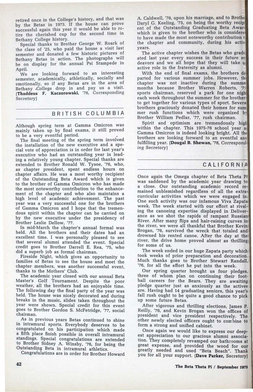 Thanks to the many generous contributions to the Beta Leadership Fund, representatives from British Columbi a, California, CaliforniaIrvine, U.C.L.A., Idaho, Oregon, Oregon State, Puget Sound, Southern California , Stanford, Utah, Washington, Washington State , Weber State, Whitman and Willamette acquired and ex changed ideas about the total operations and management of the General Fraternity and the individual chapter.