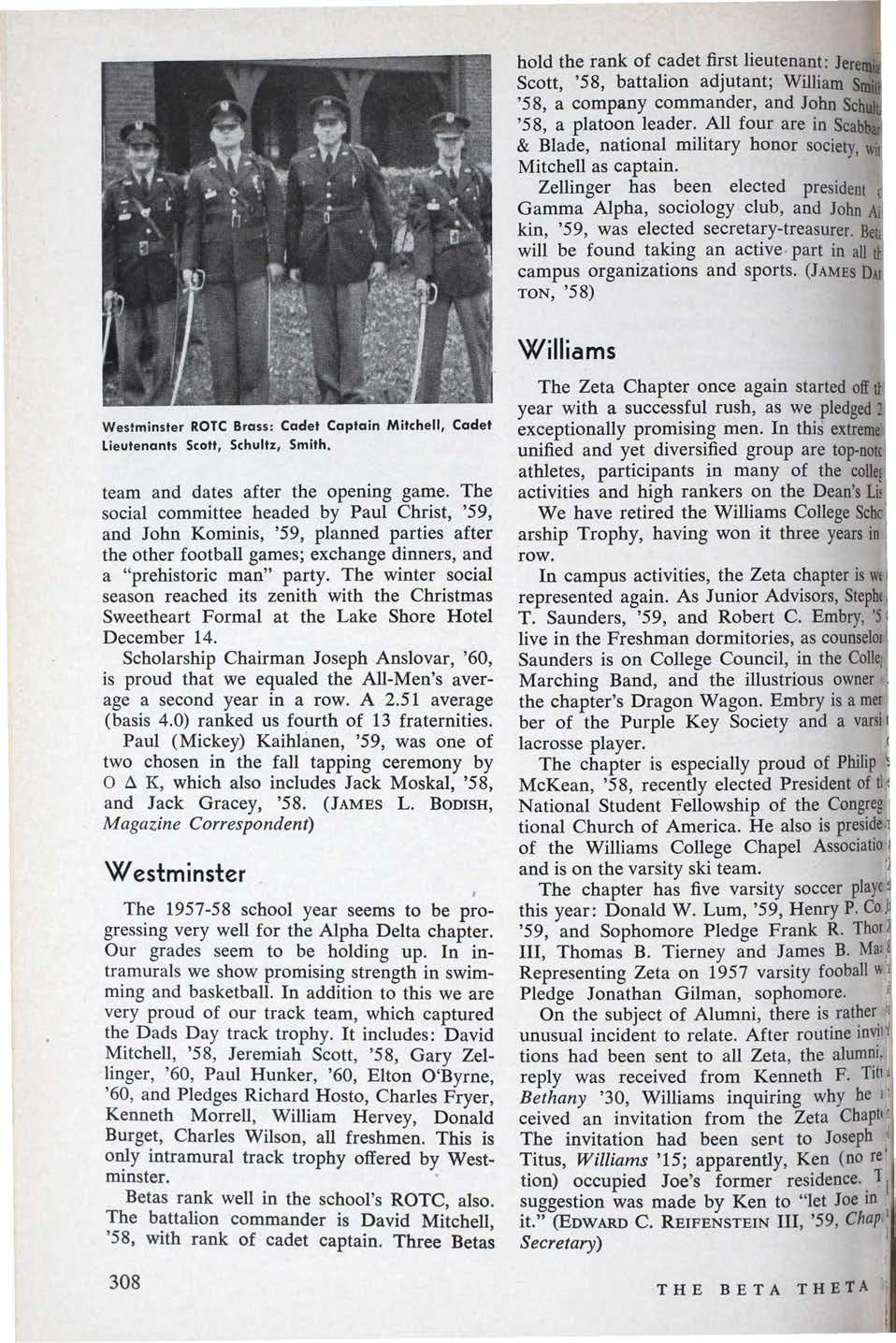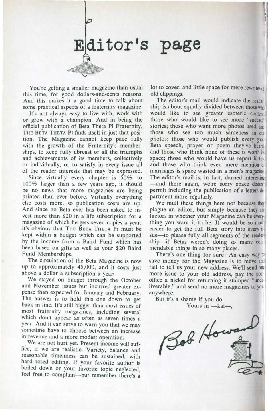 It's not always easy to live with, work with or grow with a champion. And in being the official publication of Beta Theta Pi Fraternity, THE BETA THETA PI finds itself in just that position The Magazine cannot keep pace fully with the growth of the Fraternity's memberships, to keep fully abreast of all the triumphs and achievements of its members, collectively or individually, or to satisfy in every issue all of the reader interests that may be expressed.