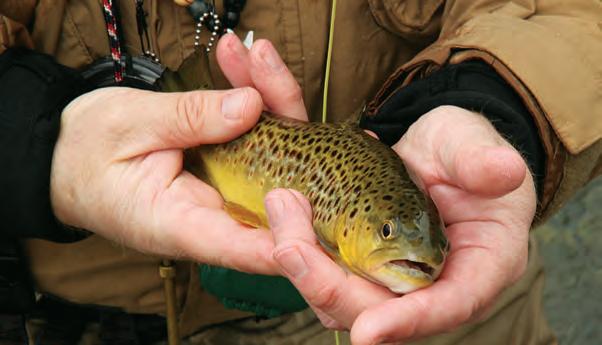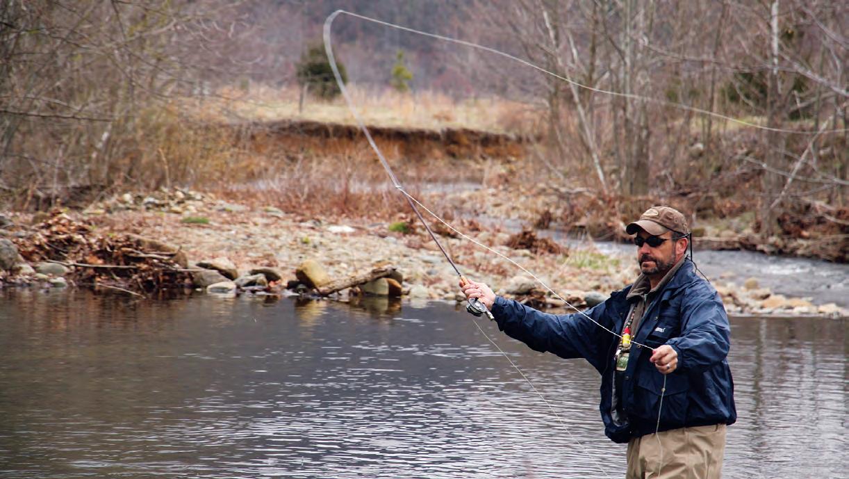 Se AS oned A ngler S W ill tell you there’s a sixth sense to knowing where the trout are hiding. In the lingo of the sport, a fly fisherman graciously “presents” his fly to the fish, which then decides whether or not to strike. I venture into the clear water in borrowed waders and cast across to a deeper spot. With a small amount of weight added to my line, my particular fly—a “wet” fly type known