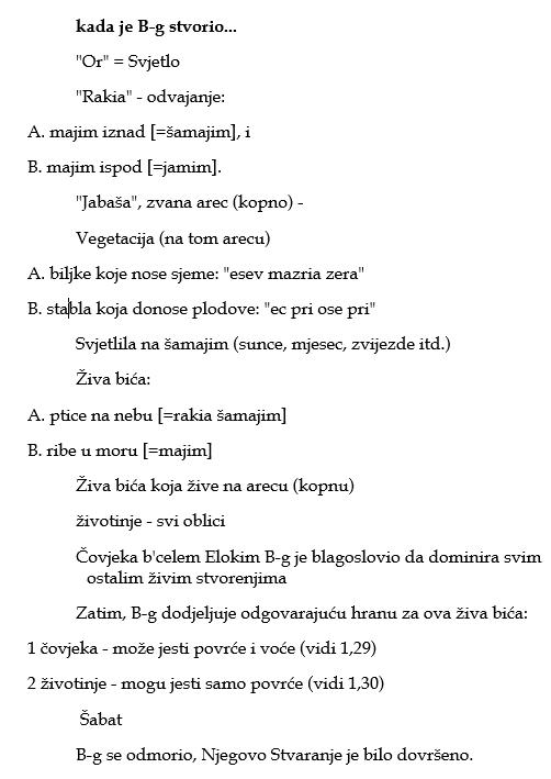 Zbog nedostatka prostora i vre mena, zadovoljit ćemo se ovdje da kažemo da prva alija opisuje stva ranje i B žje odmaranje na prvi Šabat.