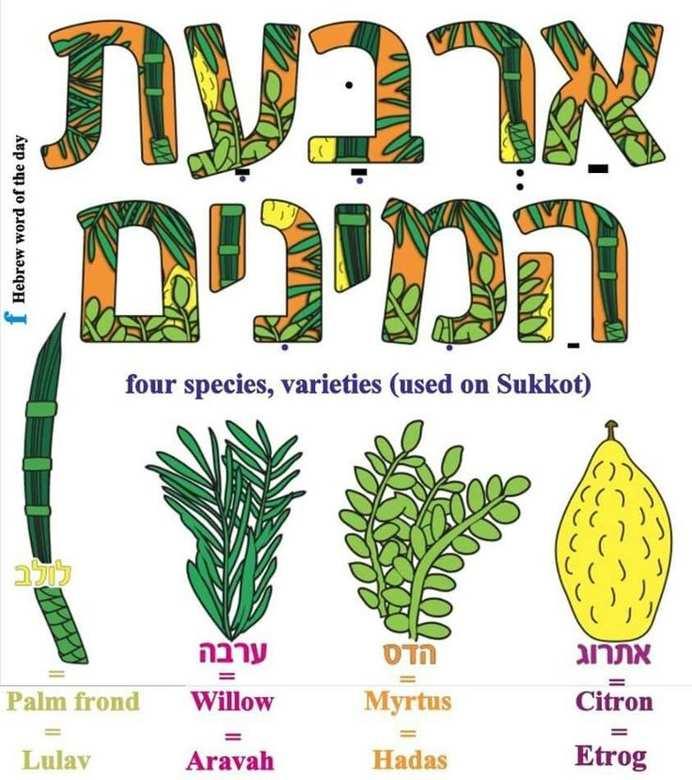četiri vrste bilja: Lulav (palminu granu), Etrog (plod jedne vrste citrusa), Hadasim (grančice mirte) i Aravot (grančice vrbe).