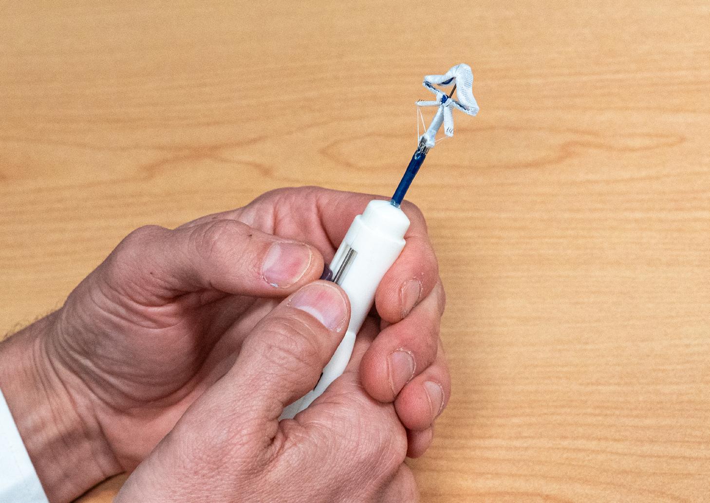 LEFT: Dr Andrew Chatfield holding a prototype of an implant system used in a TEER procedure to treat patients with conditions like mitral valve regurgitation.