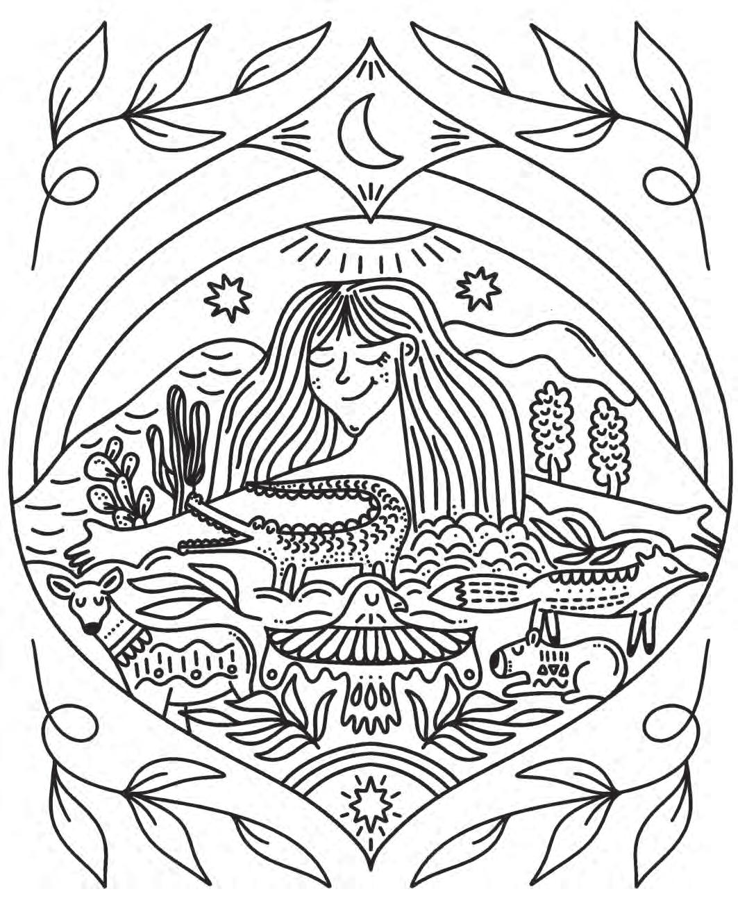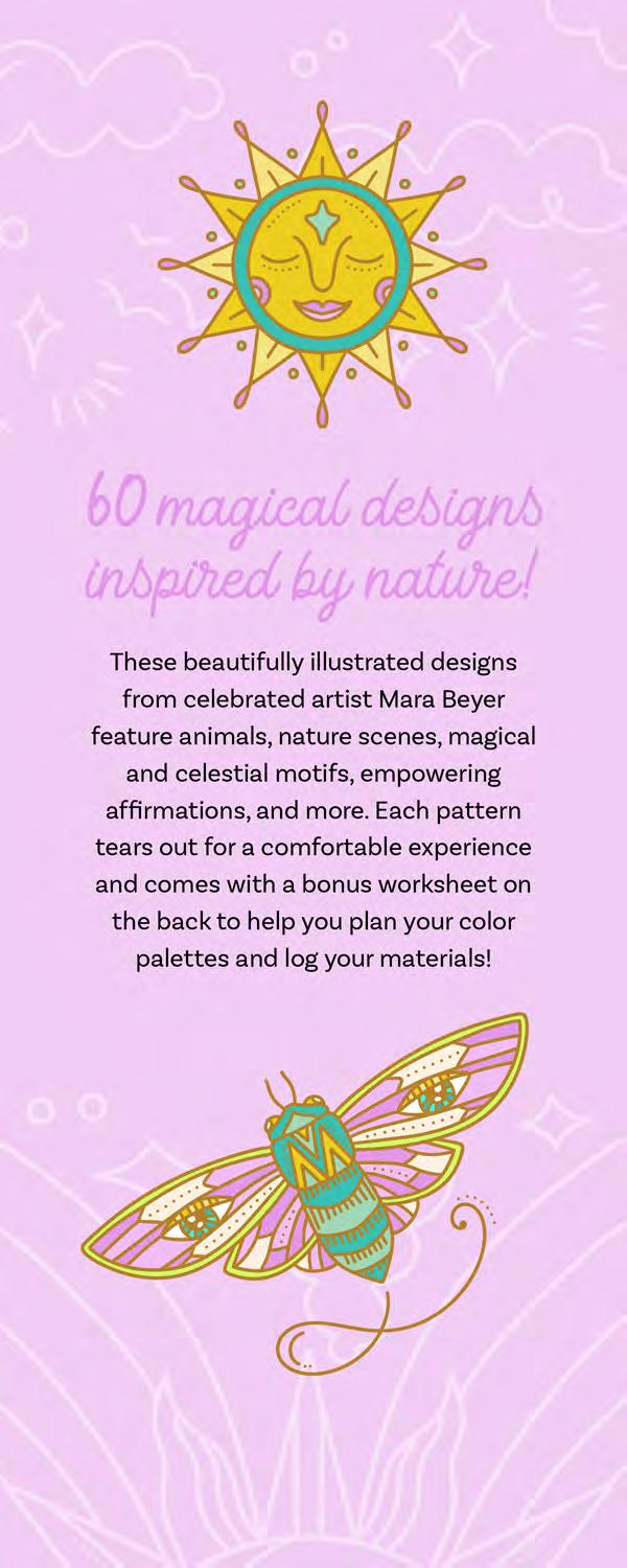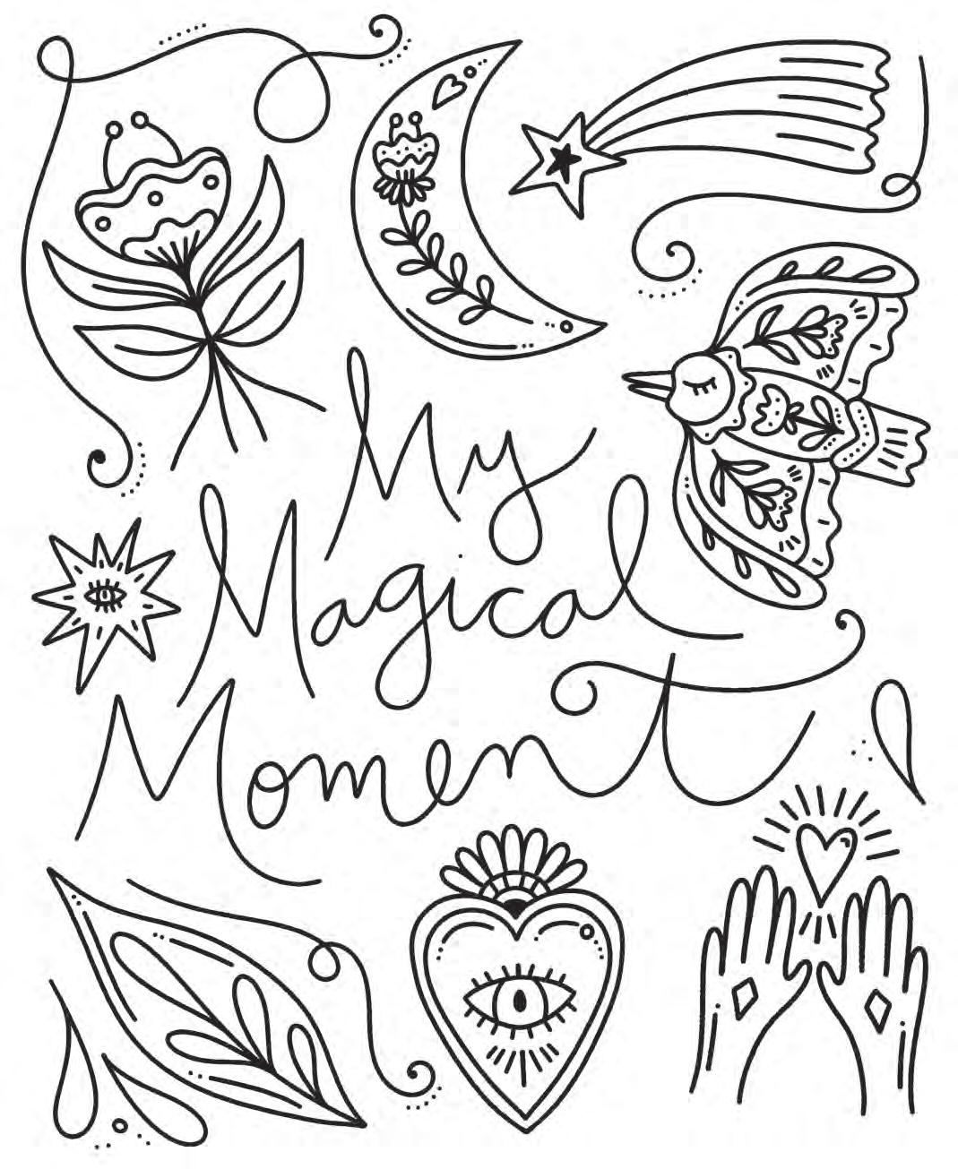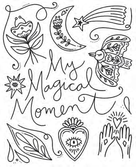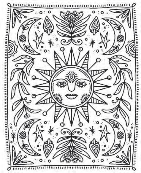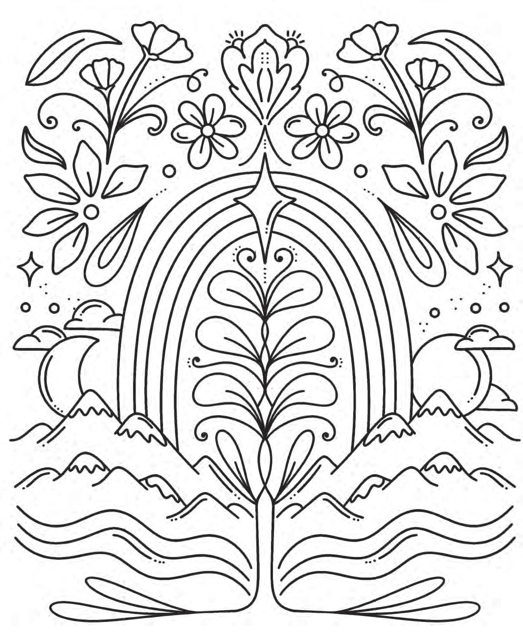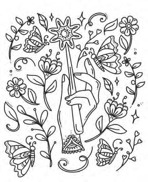 I hope you’re ready to revel in magic and start putting pencil (or marker) to paper! Feel free to dive into the following pages in any order you’d like. If you feel overwhelmed by the choices, hesitant to put your first color down, or simply creatively blocked, don’t worry—try using the Coloring Worksheet on the back of the coloring page you choose! This page will allow you to experiment with colors and establish a color palette before you commit to putting colors down on your chosen illustration. Each coloring page is also perforated if you’d like to remove it and color on a different surface or in another position.
