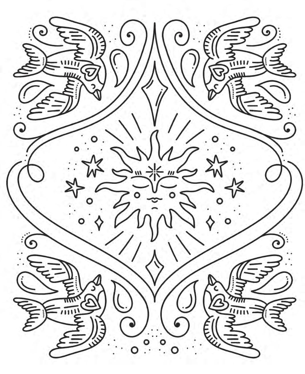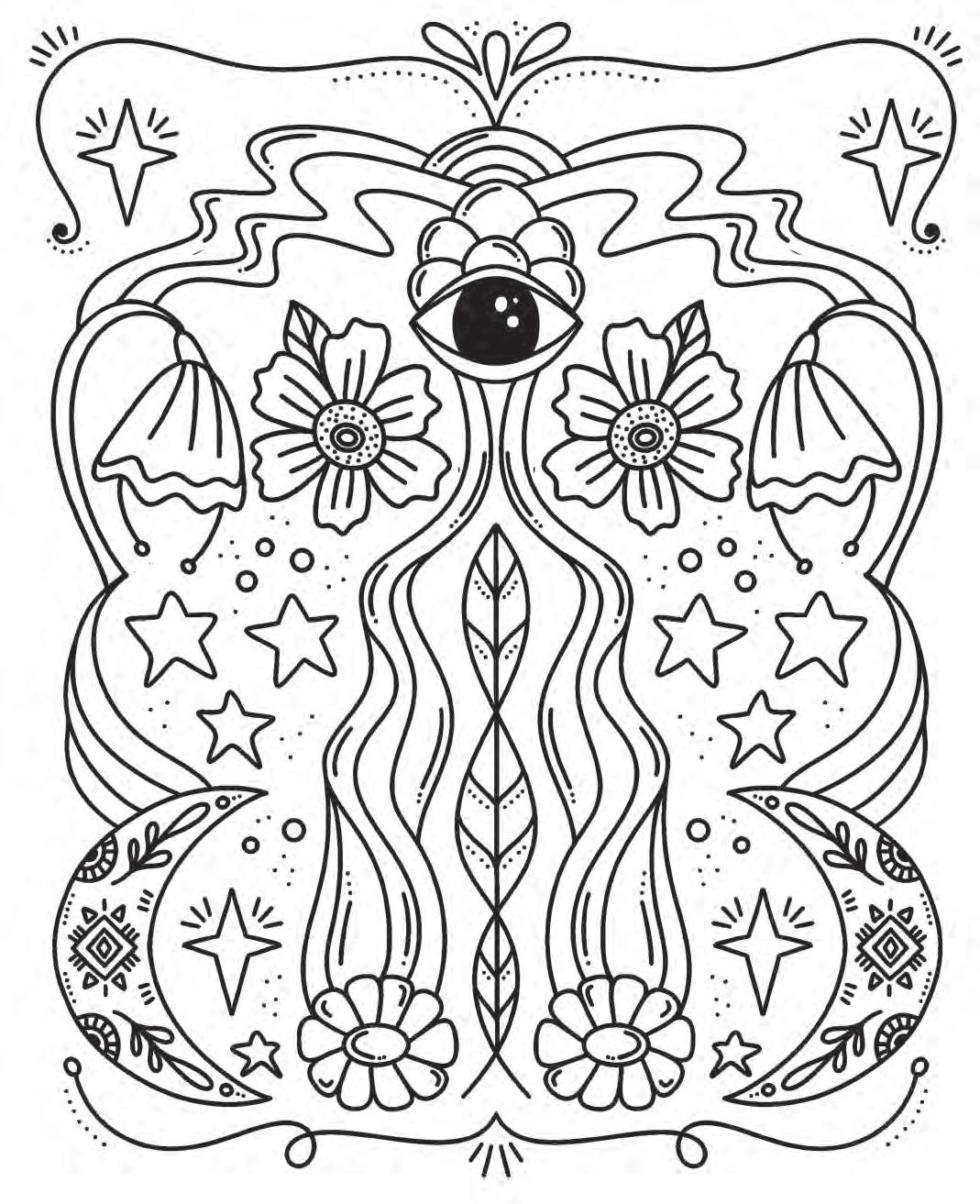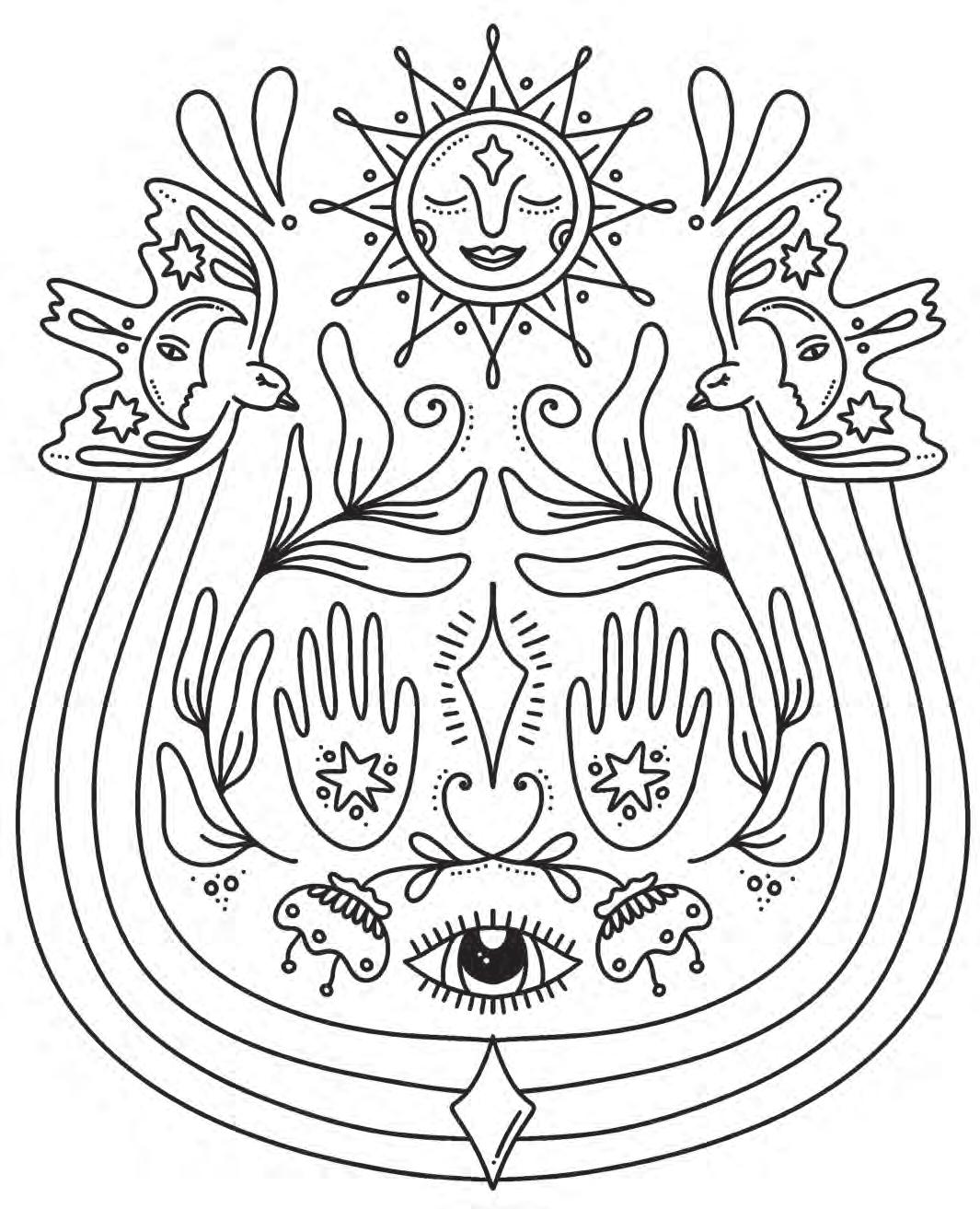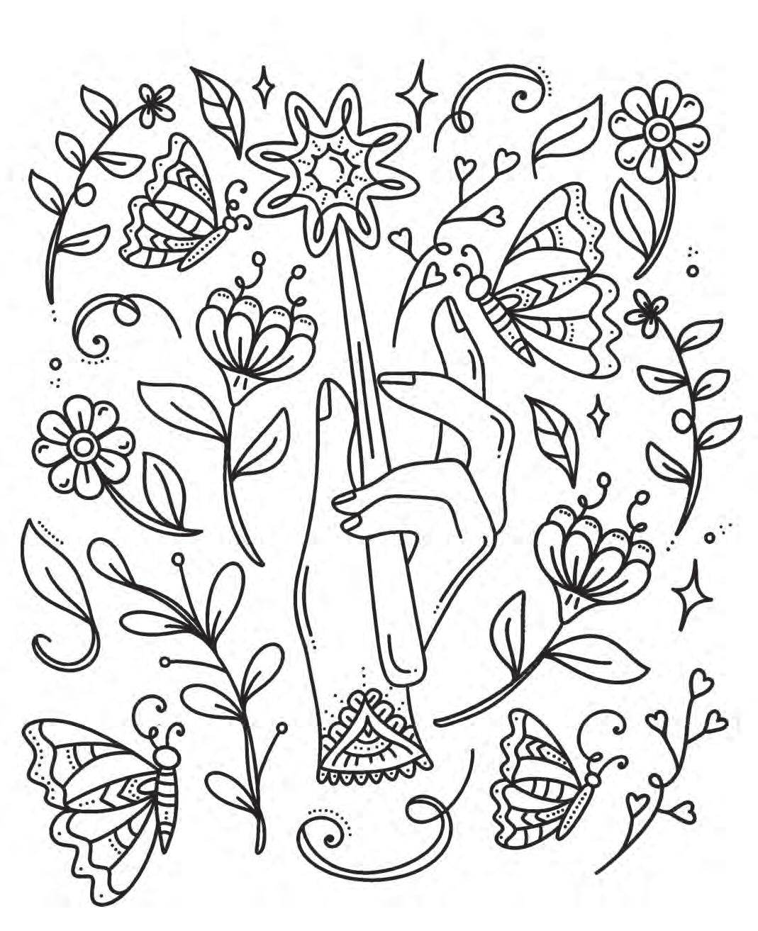 I hope you’re ready to revel in magic and start putting pencil (or marker) to paper! Feel free to dive into the following pages in any order you’d like. If you feel overwhelmed by the choices, hesitant to put your first color down, or simply creatively blocked, don’t worry—try using the Coloring Worksheet on the back of the coloring page you choose! This page will allow you to experiment with colors and establish a color palette before you commit to putting colors down on your chosen illustration. Each coloring page is also perforated if you’d like to remove it and color on a different surface or in another position.