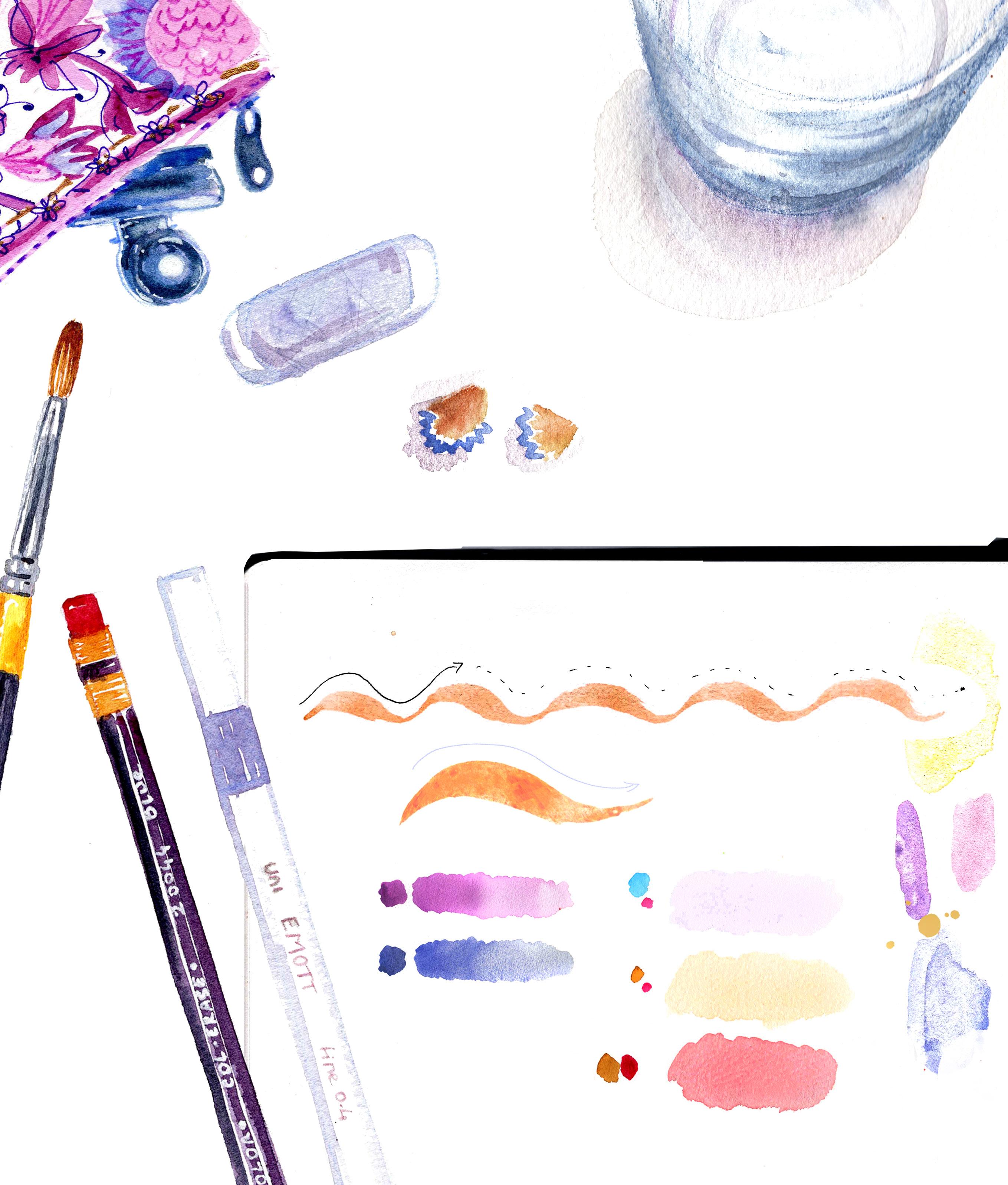 J’aime bien réaliser des croquis avant de peindre mes desserts, cela me permet de visualiser les volumes de couleurs et d’harmoniser ma mise en page. L’idéal, ce sont les Prismacolor Col-Erase, car ils sont effaçables et ne se mélangent pas à la peinture comme le font les crayons aquarellables, et ne salissent pas l’aquarelle comme les crayons à papier classiques. Ayez aussi une gomme mie de pain.