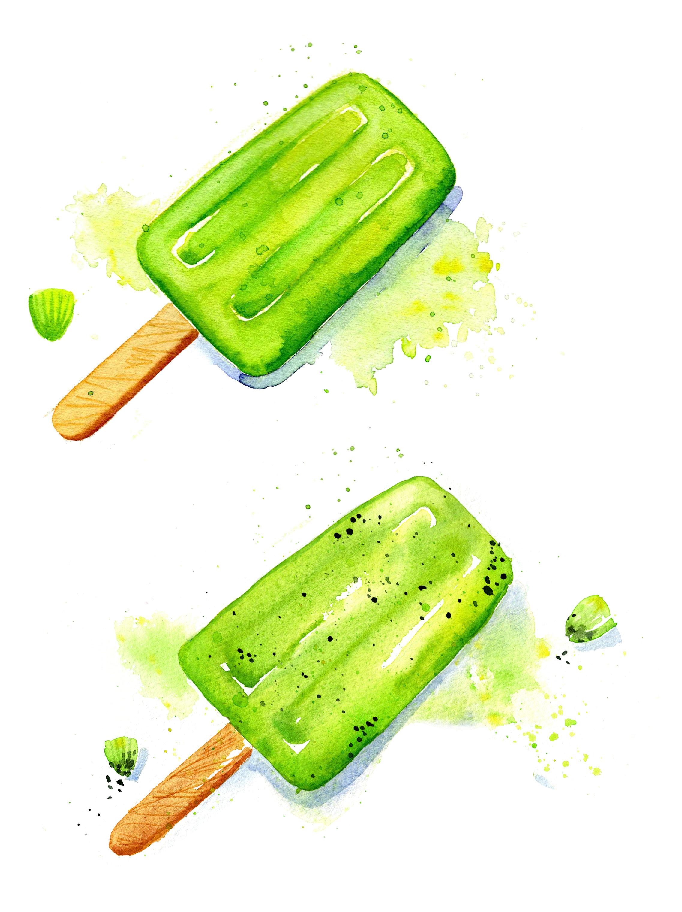 Humidifiez certaines zones autour du sorbet et déposez-y un jus jaune vert pour créer un effet fondu. Réalisez l’ombre du bâtonnet avec un ocre plus soutenu. Effectuez des éclaboussures vert et jaune dans l’humide et le sec.