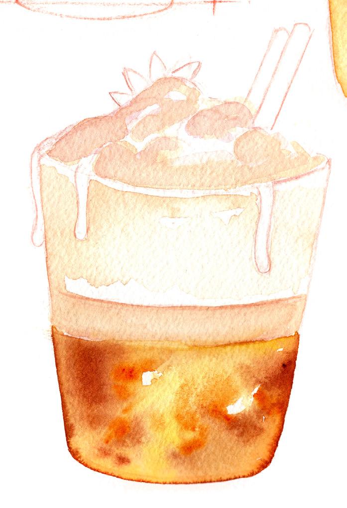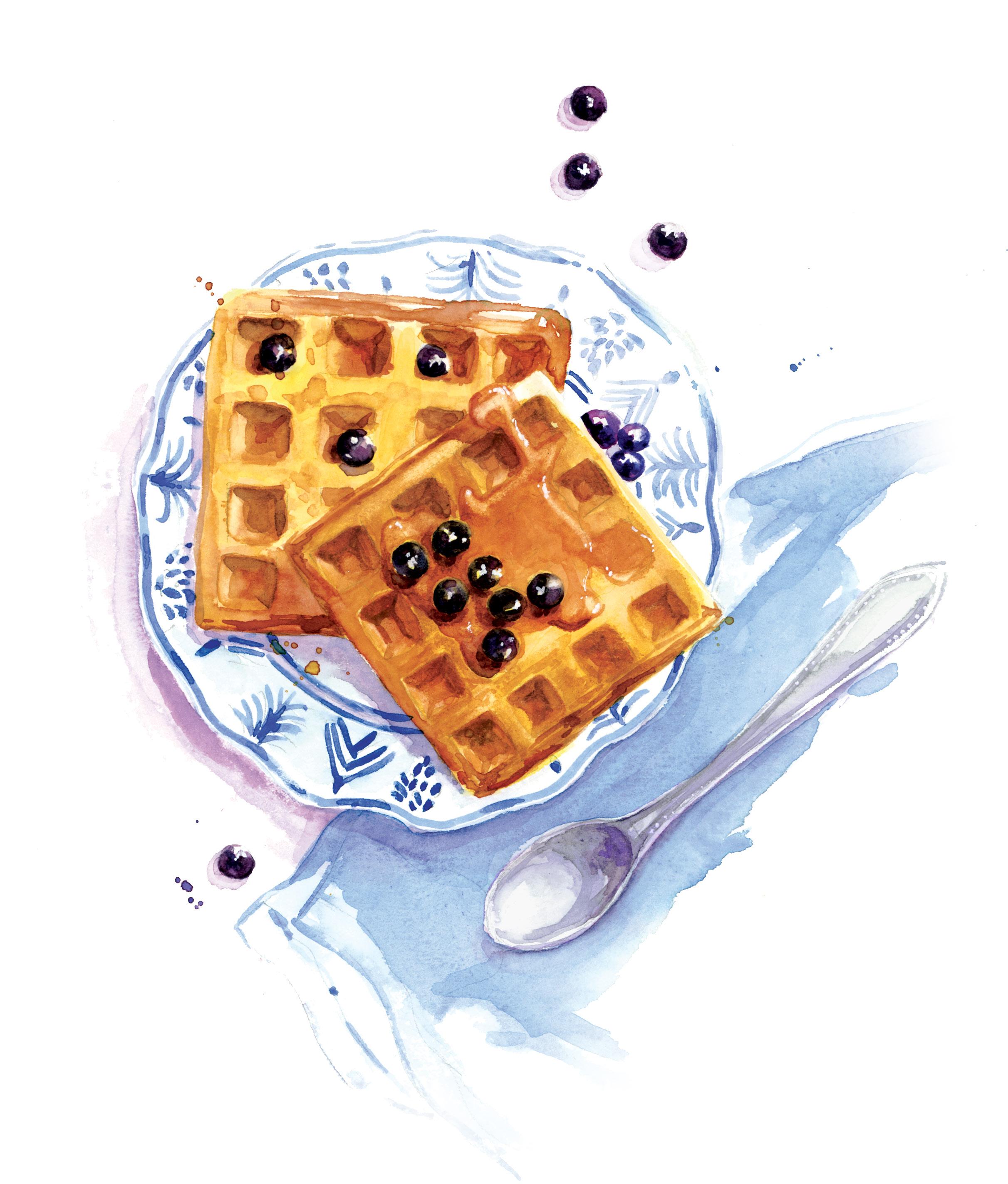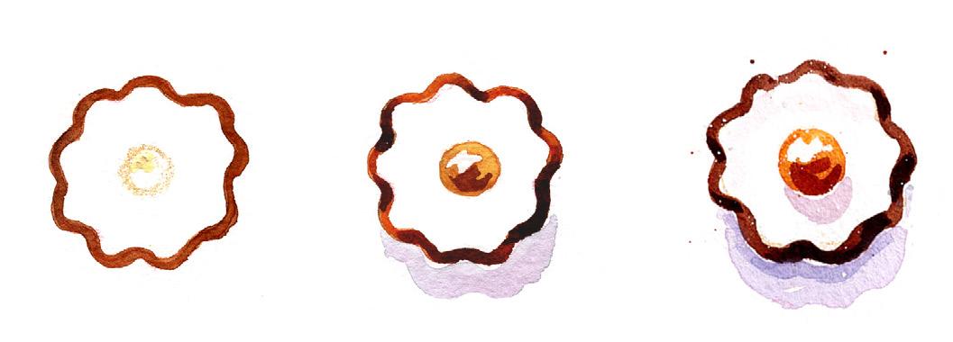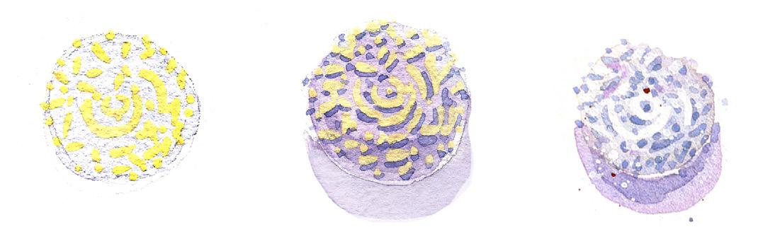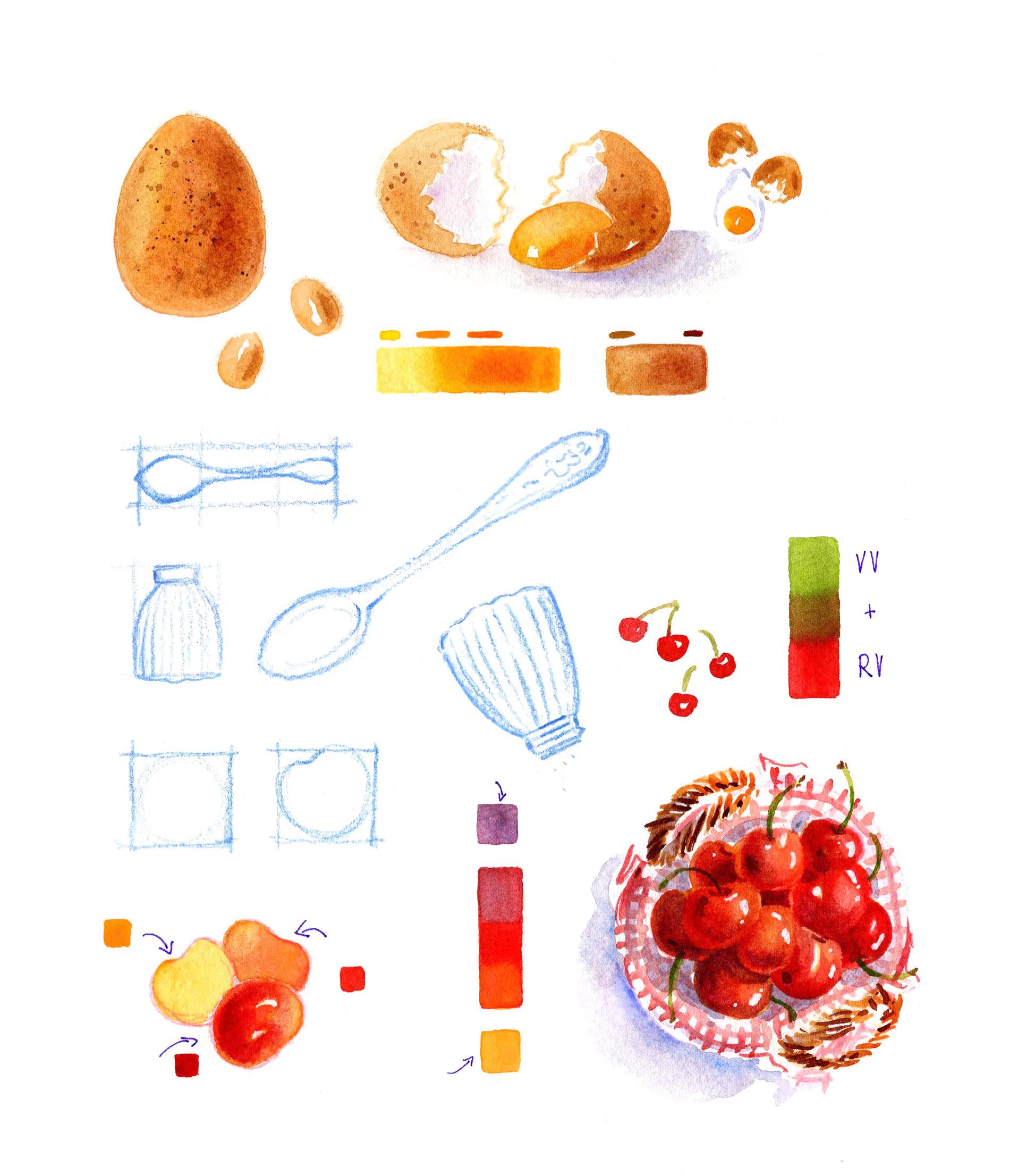 bien gourmandes et profiter de toutes les qualités et surprises que peut apporter l’aquarelle, je vous conseille de travailler en grand. La plupart de mes illustrations font 15 cm minimum et sont souvent sur un format A3.