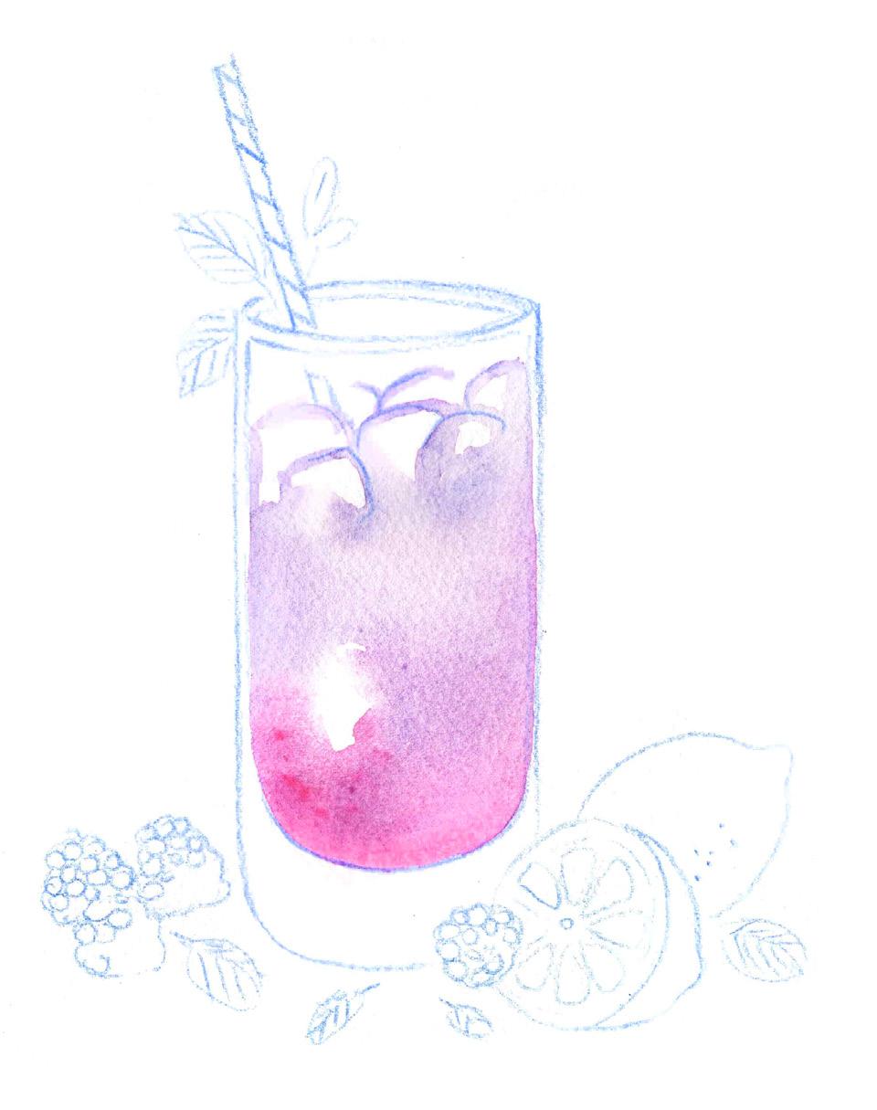 1 Dessinez le verre et le décor au crayon effaçable sur une feuille A3 pour profiter des fusions. Déposez de l’eau sur la surface du jus de fruits en évitant les bords du verre et certains glaçons. Dans l’humide, déposez du pigment opéra en bas, du pigment lavande en haut et laissez fuser.