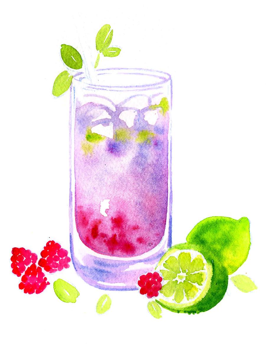 3 Sur sec, réalisez la paille et les feuilles. Ajoutez du vert pour suggérer une tranche de citron derrière les glaçons. Humidifiez les zones d’arrièreplan avec le pinceau et faites des fusions de vert et de jaune. Renforcez les framboises avec un mélange de rose et de laque de Garance et les reflets du pied du verre avec un bleu de cobalt.