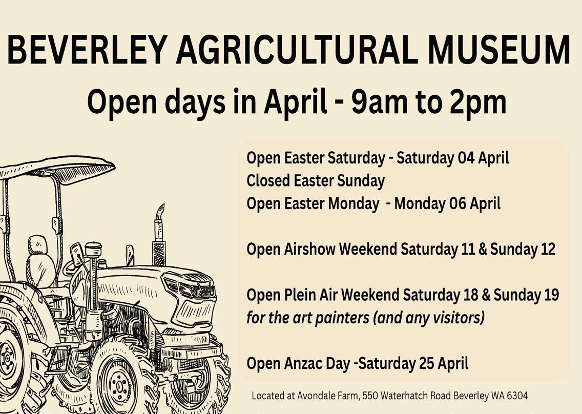 The Beverley Ag Museum at Avondale Farm will be open to the public on Saturday 11 April (volunteer working day) and Sunday 12 April between 9.00am and 2.00pm, several changes have been made, with many items never displayed previously. Free entry.