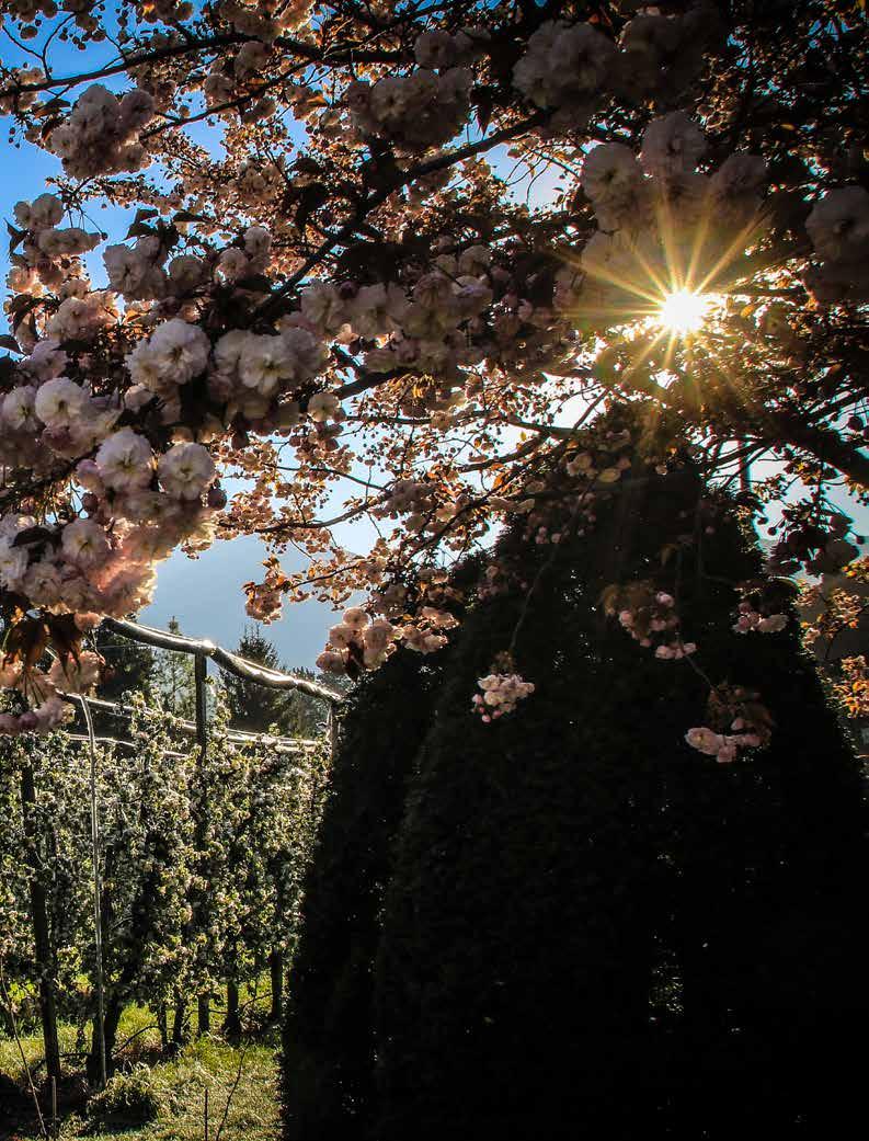 Daran vorbei erreichen wir einen breiten Weg, der mit einer originellen Beleuchtung versehen ist. Wir kommen aus dem Staunen nicht heraus, denn hier wachsen Olivenbäume, Kakteen, Palmen und Zypressen. Hinter dem zarten Rosa der blühenden Bäume leuchten die weißen, schneebedeckten Gipfel des oberen Vinschgau. An Bienenständen vorbei durch ein großes Gatter kommen wir zu einer kleinen Holzbrücke. Jenseits müssen wir kurz einen kleinen Bach entlang steiler hinunter. Dann wird es wieder flacher und durch ein