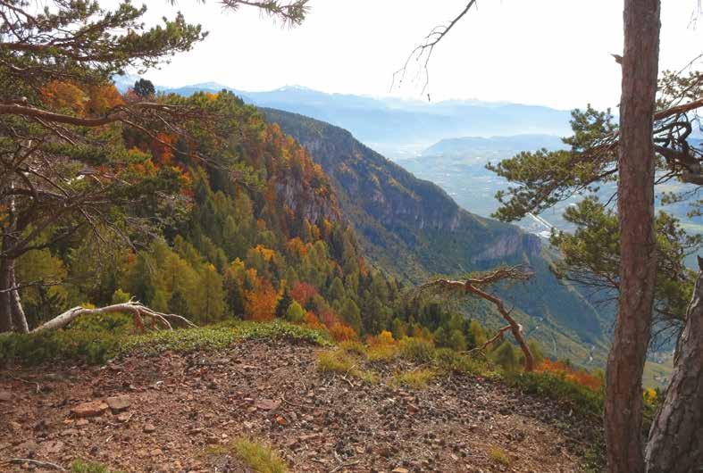 Wir wandern weiter bis zur nächsten Abzweigung, wenden uns nun nach rechts und folgen jetzt der Markierung 2. Immer wieder ergibt sich ein herrlicher Panoramablick über das gesamte Überetsch. Die vielen Lärchen kleiden sich nur zögerlich ins gelb. Sobald sich der breite Weg abwärts neigt, folgen wir wieder dem ansteigenden Steig (immer Mark. 2!), kommen an einer kleinen Almhütte vorbei und entdecken plötzlich friedlich grasende Haflinger Pferde zwischen den Lärchen. Nun geht es geht kurz hinauf zu einer Hofstelle. Wir umrunden die Scheune und kommen zu zwei Häusern und einen Bildstock. Direkt oberhalb grüßt ein hohes Wetterkreuz.