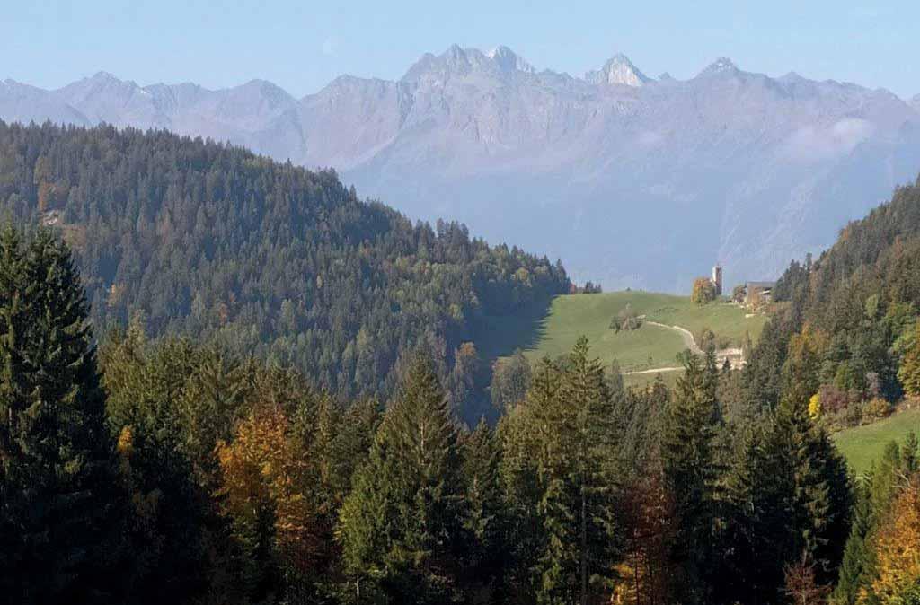 Wir bleiben an der linken Straßenseite; zwischen Scheune und Straße führt die Markierung in Richtung Hafling. Es geht erst der mächtigen Straßenstützmauer entlang auf einem schönen Steig weiter, von hier aus haben wir einen herrlichen Blick auf Vöran mit seinem spitzen Kirchturm. Nun steigt der Weg wieder leicht an – und schon stehen wir auf einem einmaligen Aussichtsplatz mit Tisch und Bänken. Gerne nützen wir die Gelegenheit