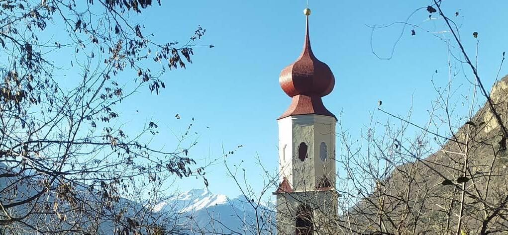 Weiter geht es durch Obstwiesen, nun ihrer Früchte und Blätter beraubt im kahlen Winterkleid. Umso kräftiger leuchtet der rote Zwiebelturm der Partschinser Pfarrkirche, die gleich drei Heiligen geweiht ist: Petrus, Paulus und Nikolaus. Von der Kirche sind wir binnen kurzem, abwärts gehend, am Busbahnhof, wo wir bald in Richtung Meran fahren, dankbar heute so viel an Sonne getankt zu haben.