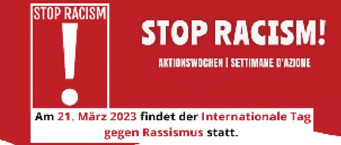 Jedes Jahr schließen sich Südtiroler Vereine und Organisationen rund um den 21. März, der internationale Tag gegen Rassismus, auf der Plattform www.stopracism.it zusammen. Mit Fortbildungen, Ausstellungen, Konzerten, Filmabenden oder Buchvorstellungen leisten sie Beiträge im Einsatz gegen Rassismus in Südtirol.