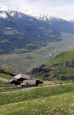 Bald erreichen wir den Wandhof. Zwischen Haus und Scheune hindurch geht es und im Rückblick entdecken wir ein sehr schönes Fresko an der Hausmauer. Ab- und aufwärts, zwischendurch ganz eben, überqueren wir typische Sonnenberghänge und kommen zur Zufahrtsstraße und zum Kopfronhof mit einem mächtigen Kreuz und seiner kleinen Seilbahn, die jedoch längst ausgedient hat. Einst waren auch hier hungrige Gäste zu Speis und Trank geladen, die mit der Seilbahn vom Schnalstal aus hochfuhren. Weiter führt nun der Steig um eine Biegung und schon sehen wir den Walderhof mit der schmucken, liebevoll renovierten Franziskuskapelle. Ein gemütlicher Buschenschank, wo jeder willkommen ist, der einer Stärkung bedarf! Bald heißt es wieder bergauf zu gehen und wir erreichen den neu gebauten Innerstellhof.