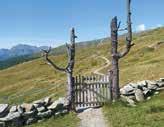 DIE EINSAME STEINBERGL - ALM Auf Markierung 12 B wandern wir nun an einem hohen Wetterkreuz vorbei abwärts. Der Pfad windet sich nach rechts und im Wechsel von Almgelände und Wald kommen wir rasch weiter. Beeindruckend sind die uralten Wetterlärchen, die von so manchem Sturm und Wetter erzählen könnten. Plötzlich mündet unser Steig in jenen, der direkt zum Hasenöhrl führt, und es geht mit der Markierung 14 weiter. Kurz wird es steiler und schon sehen wir die Alm und viel gemütlich weidendes Vieh unter uns. In engen Serpentinen führt der Steig direkt