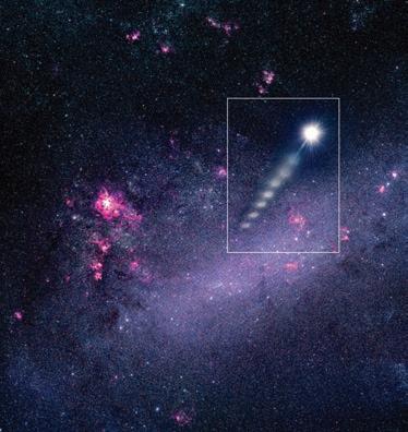 Nel periodo in cui vengono celebrate più che in ogni altro le “stelle cadenti” (in realtà frammenti di materiale interplanetario), grazie allo sciame delle Perseidi di agosto, (vedi a pag. 61), parliamo anche di vere e proprie stelle cadenti (vedi la news a pag. 6 e l’articolo a pag. 126). Ma esistono per no le “galassie cadenti”. In gura vediamo (nel riquadro) un gruppo di galassie che sta precipitando all’interno dell’ammasso di galassie della Chioma di Berenice, lasciandosi dietro un’enorme coda di gas surriscaldato. La scoperta è stata realizzata grazie all’osservatorio a raggi X Chandra della Nasa, che ha puntato i suoi strumenti verso il gruppo di galassie NGC 4839